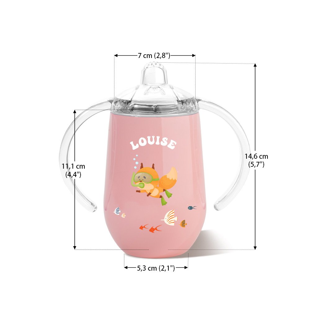 Dieser Wasserbecher ist mit Darstellungen von Tieren aus der Unterwasserwelt verziert. Sowohl der Name als auch das Tiermuster können individuell gestaltet werden. Insgesamt stehen 20 Cartoon-Tiermotive zur Auswahl, die auf dem Becherkörper angebracht sind. Das Motiv der tauchenden Tiere erfreut Kinder beim Trinken von Wasser.