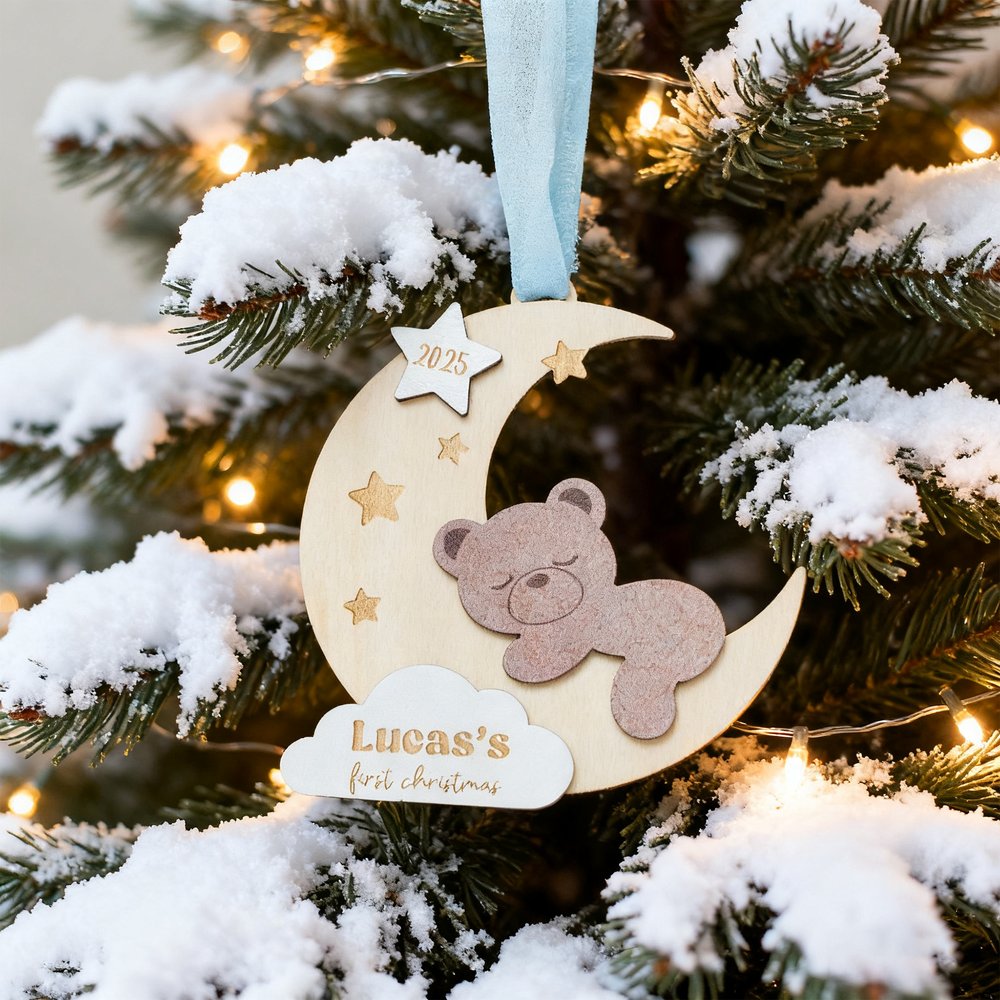 Im Mittelpunkt dieses Designs steht ein Babybär, der sich an eine Mondsichel schmiegt und Elemente wie Wolken und Sterne enthält. Sein Stil strahlt kindliche Unschuld und Wärme aus und passt perfekt zum Thema des ersten Weihnachtsfestes eines Babys. Mit einer Auswahl von drei Bandfarben und einer individuell gestaltbaren Namens- und Jahresgravur verbindet dieses Ornament dekorativen Reiz mit persönlicher Bedeutung.