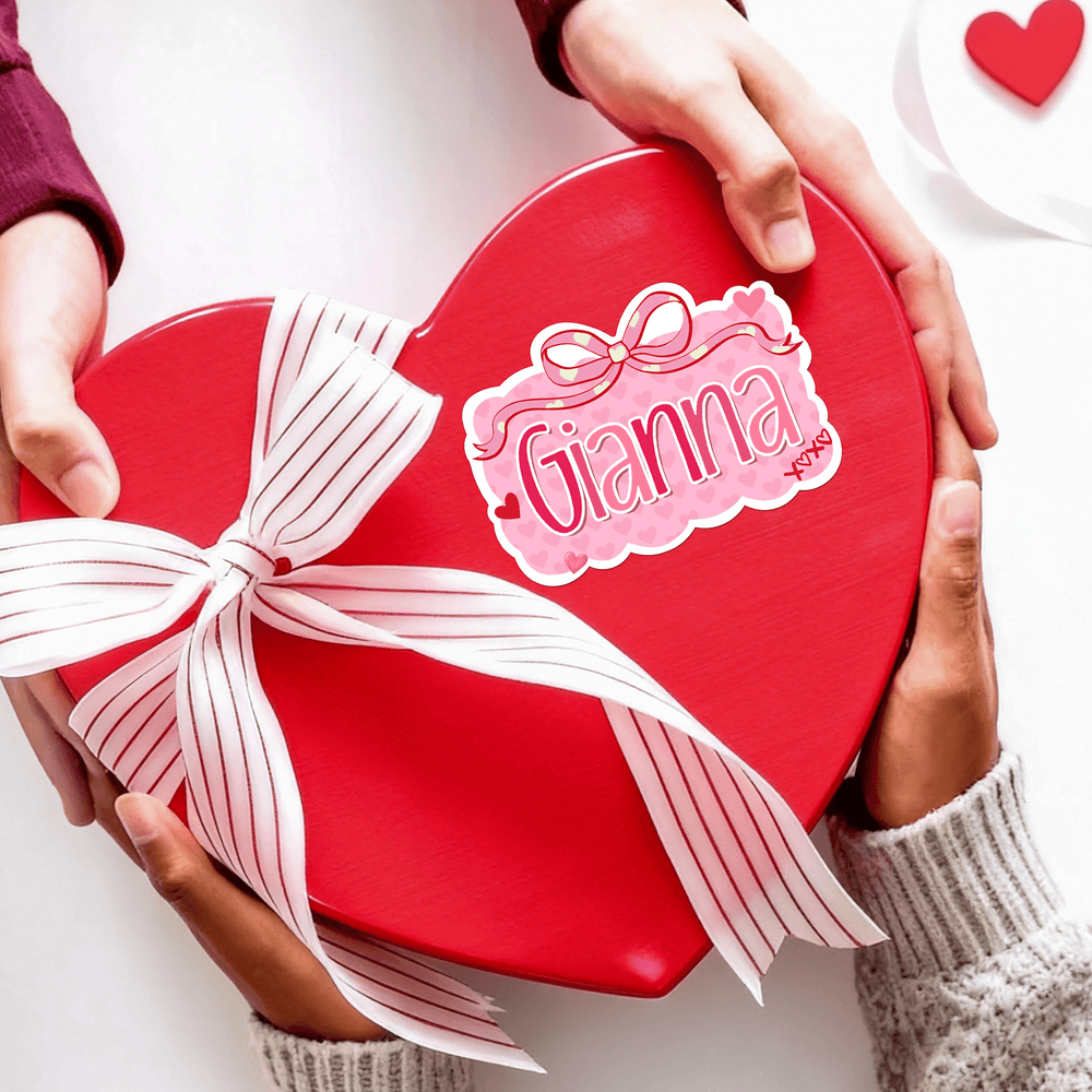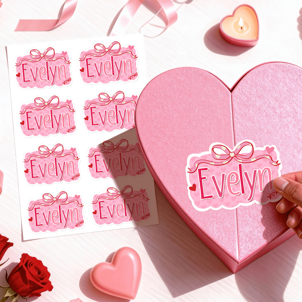 Dieser individuelle Aufkleber zeigt einen Design-Hintergrund aus rosa und Herzmustern, der mit eleganten Schleifenmotiven akzentuiert ist und so ein romantisches und süßes Gesamtbild schafft. Er unterstützt das Hinzufügen eines persönlichen Namens und macht jeden Aufkleber zu einer einzigartigen Dekoration, die herzliche Gefühle vermittelt und den Geschenken einen raffinierten und sanften Sinn für Rituale verleiht.