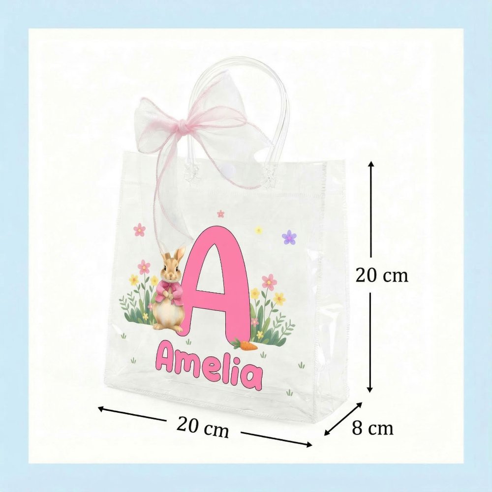 Diese Tasche ist mit einem niedlichen Osterhasenmotiv gestaltet und kann mit Ihrer eigenen Initiale sowie Ihrem Namen personalisiert werden. Das transparente, schlichte und zugleich liebevolle Design sorgt für eine fröhliche Osterstimmung und verleiht der Tasche eine persönliche Note, die Kinder sofort begeistert.
