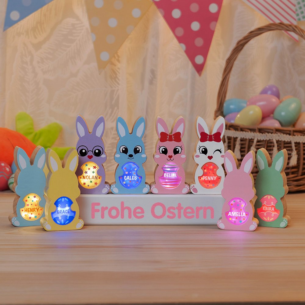 Unsere Dekoration basiert auf dem niedlichen Hase-Thema und kombiniert farbenfrohe Osterei-Elemente, um eine festliche Atmosphäre zu schaffen. Sie können die Farben, Gesichtsausdrücke und Stile von 2 bis 10 Hasen sowie die Eier individuell gestalten, um Ihre Familienmitglieder zu repräsentieren. Zudem kann der Familienname auf der Basis graviert werden, um dieses Dekorationsstück noch einzigartiger und persönlicher zu machen.