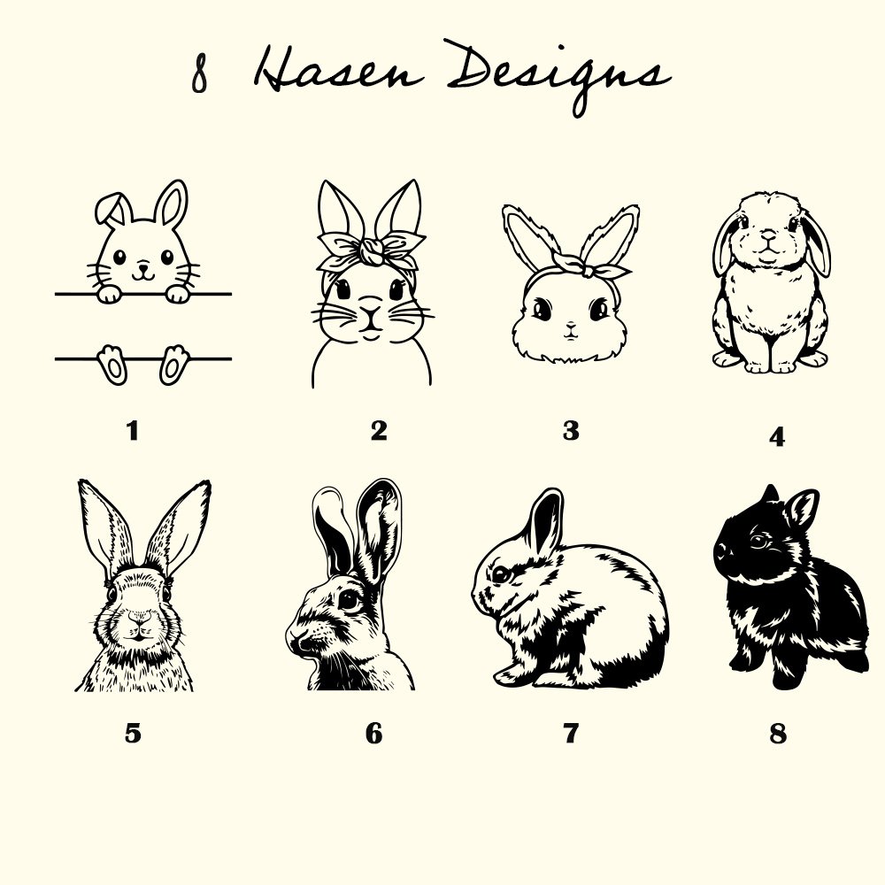Das Geschirr kann mit einem beliebigen Namen oder Wort mit maximal 10 Zeichen personalisiert werden. Darüber hinaus können Sie auch Ihr Lieblingshase Muster und die Farbe des Bestecks wählen.