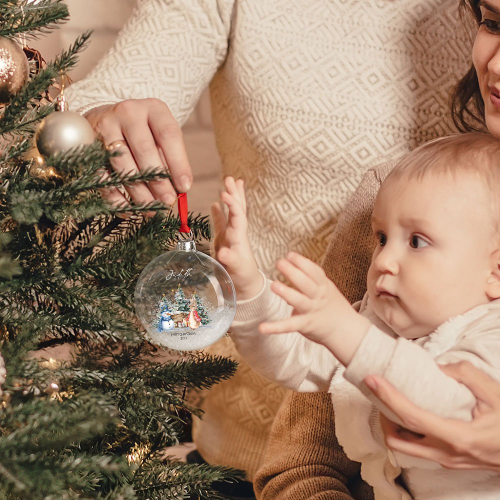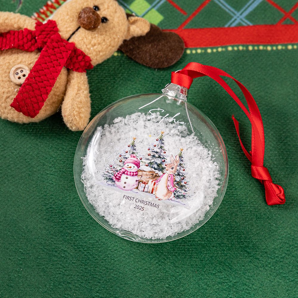 Feiern Sie die Ankunft des neuen Lebens mit unserem Ornament. Es zeigt einen niedlichen Hasen mit einem Schneemann und einem Weihnachtsbaum und ist in der Mitte mit weißen Pailletten gefüllt, genau wie Schneeflocken. Sie können auch den Namen und das Jahr Ihres Babys angeben, um der Weihnachtsdekoration eine warme Note zu geben.