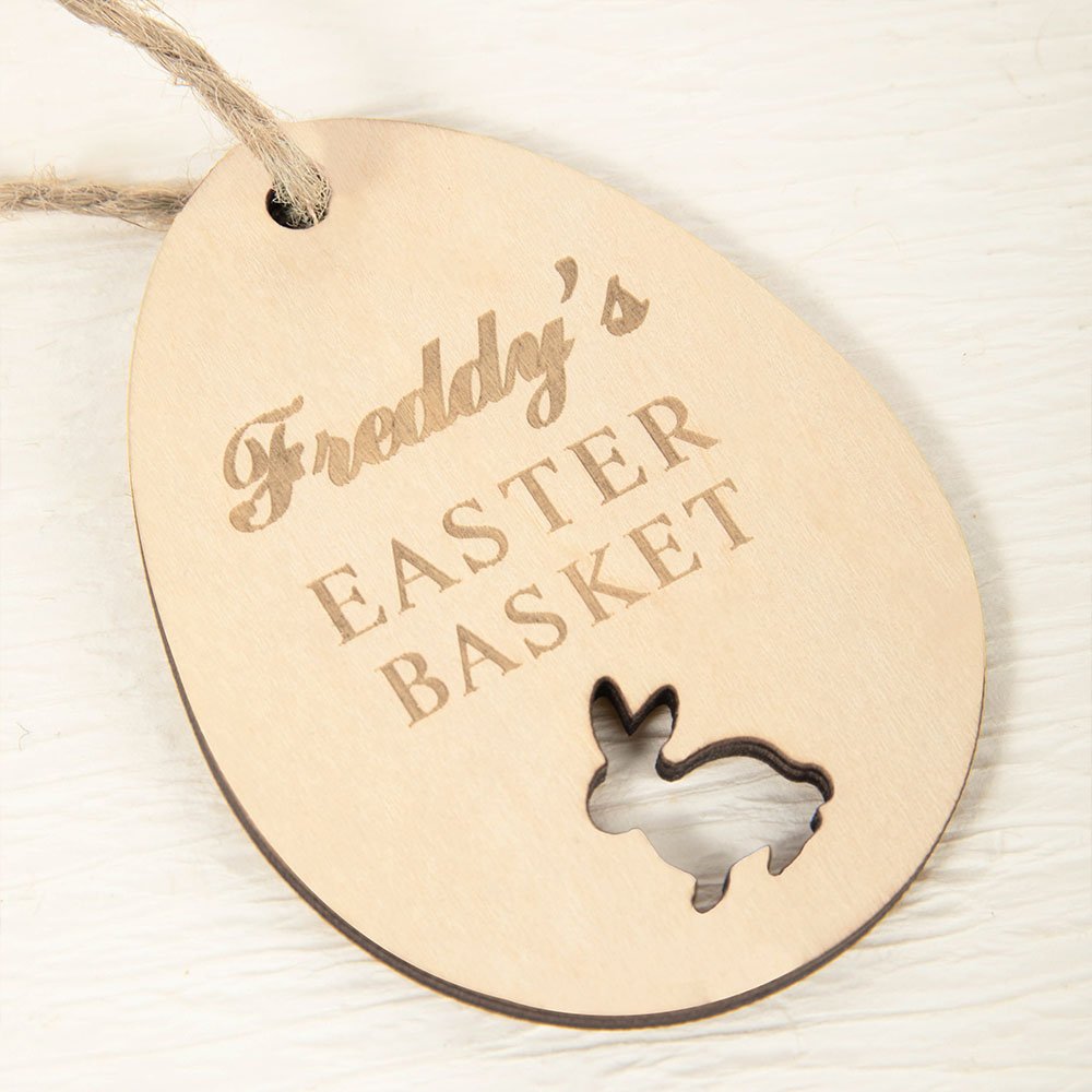 Dieser bezaubernde Osterkorb-Anhänger hat die Form eines Ostereis und ist mit einem niedlichen, ausgehöhlten Hasenmotiv versehen. Der eingravierte Spruch "EASTER BASKET" sorgt für eine festliche Atmosphäre. Du kannst ihn mit dem Namen deines Kindes personalisieren, um ihn einzigartig zu machen.