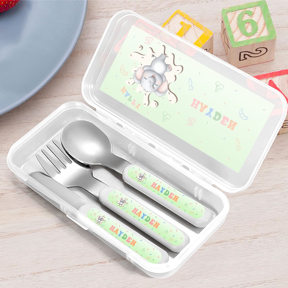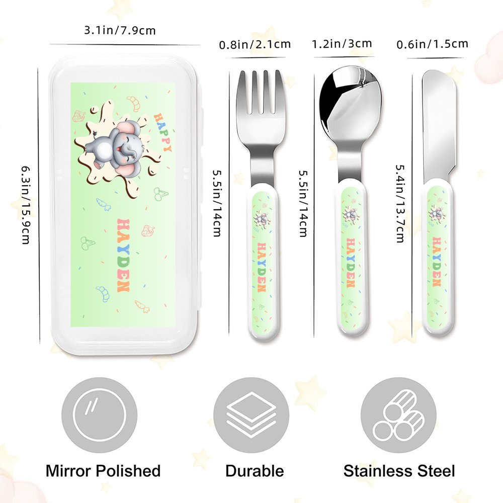 Personalisierte niedliche Cartoon Tier Kinder Messer Gabel Löffel 3 Stück Besteck Set mit Namen und Fall täglichen Gebrauch Geburtstagsgeschenk für Kinder
