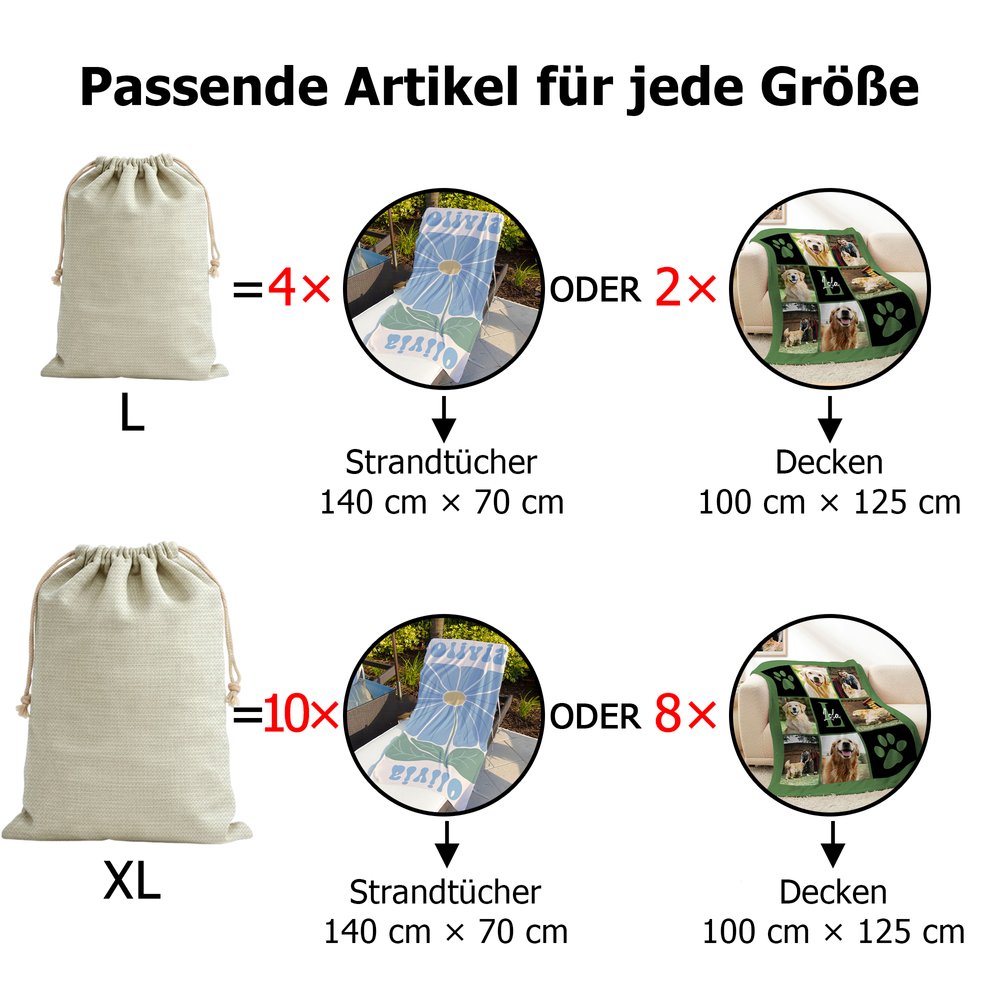 Unsere Geschenksäcke bestehen aus erstklassiger Baumwolle, Leinen und Canvas und überzeugen durch ihre besondere Strapazierfähigkeit – selbst schwere Lasten tragen sie mühelos. So können Sie Geschenke oder andere Gegenstände bedenkenlos verpacken. Der lebendige und langlebige Druck ist resistent gegen Verblassen und Abblättern und behält auch nach mehrmaligem Gebrauch und Waschen sein attraktives Erscheinungsbild. Der Kordelzug lässt sich einfach öffnen und schließen und besticht durch seine Robustheit. Dank der ausgezeichneten Qualität sind die Geschenksäcke mehrfach wiederverwendbar, was sie zu einer umweltfreundlichen Wahl macht und gleichzeitig eine stilvolle Möglichkeit bietet, bleibende Urlaubserinnerungen zu bewahren.