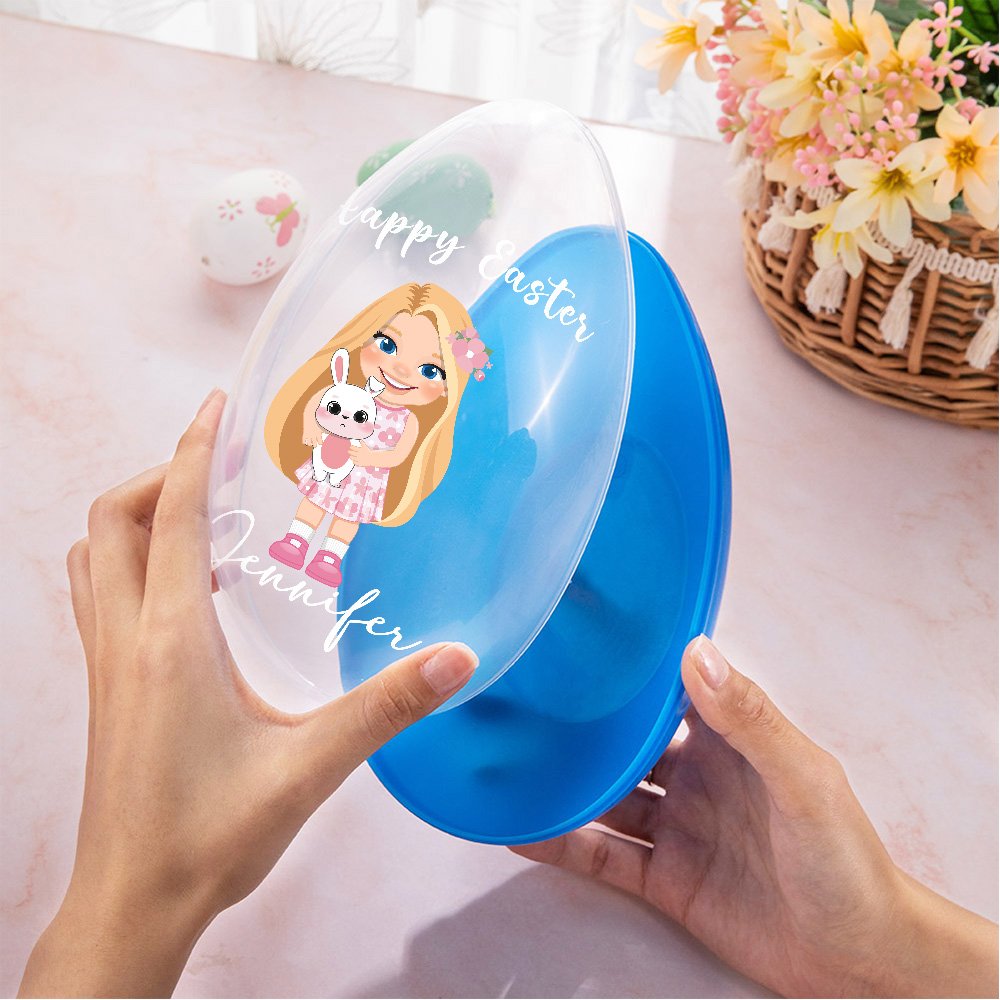 Unsere Ostereier sind mit einem niedlichen Cartoon-Mädchen bedruckt, das farbenfrohe Kleidung trägt und verschiedene niedliche Dekorationen wie Kaninchen und Blumenkörbe in der Hand hält, die die freudige Atmosphäre von Ostern zeigen. Die Worte "Frohe Ostern" sind darauf verziert, was die festliche Stimmung des Festes noch verstärkt. 4 verschiedene Farben bereichern die Auswahl der Kinder. Anpassbare Namen machen es noch exklusiver.