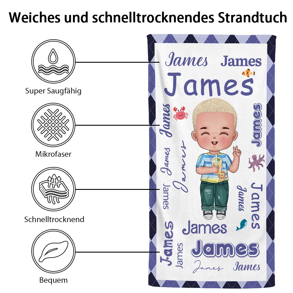 Dieses Strandtuch besticht durch ein kreatives Wortwolken-Design mit Namen und einem süßen Cartoon-Charakter. Nutzer können Geschlecht, Frisur, Haarfarbe, Kleidung (Oberteil und Unterteil), Hautfarbe und Augenfarbe individuell anpassen. Zudem stehen acht verschiedene Farben für das Tuch zur Auswahl, ebenso wie Schleifen- oder Meeresmotive – voller kindlicher Unschuld, die Kinder garantiert lieben werden.