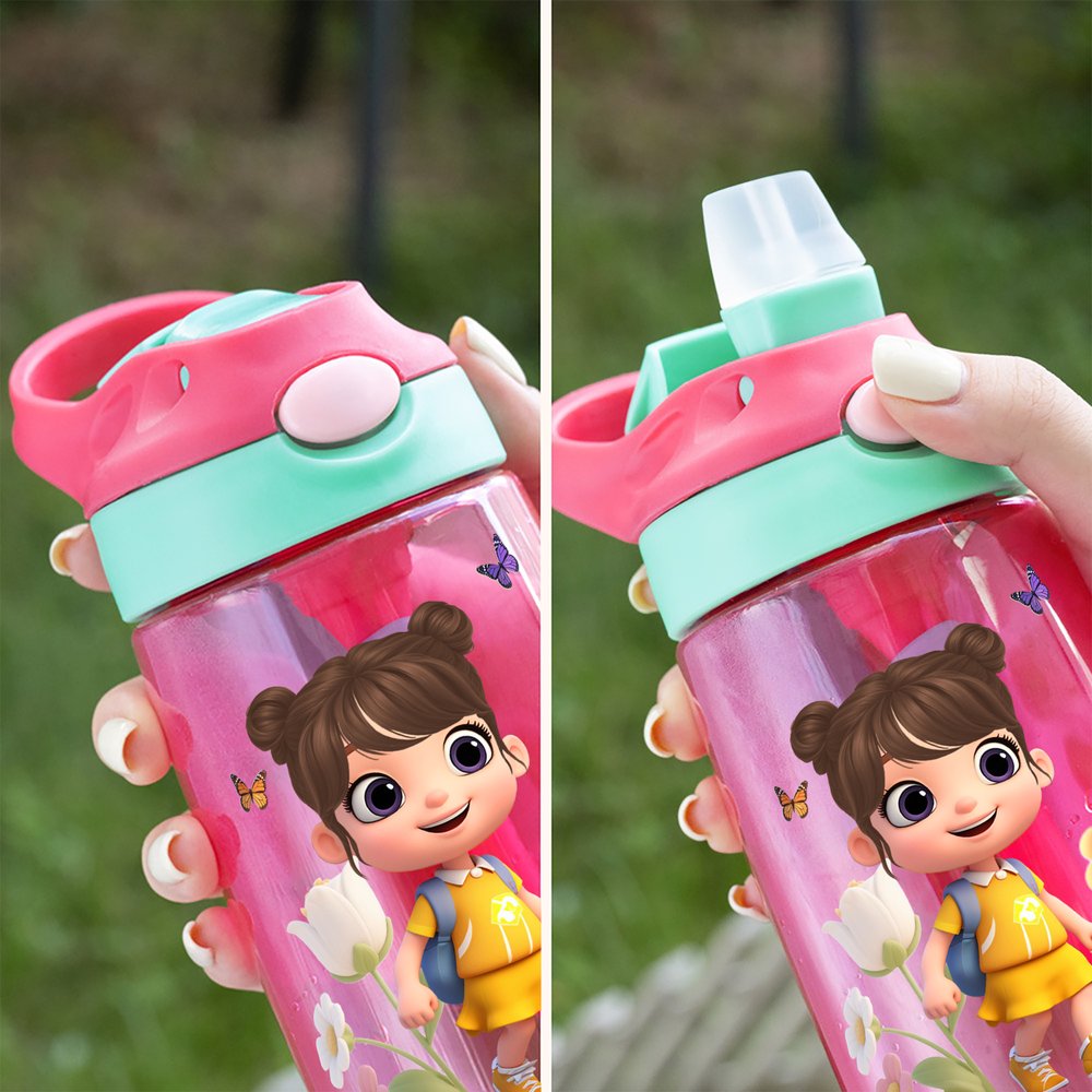 Mittels Drucktechnik wurde das lebendige Cartoon-Bild auf der Flasche übertragen, zusammen mit einem individuellen Namen, um ein exklusives Logo zu schaffen. Für den Hintergrund stehen zwei verschiedene Motive zur Auswahl: ein Blumenhintergrund und ein Graffiti-Hintergrund mit Linien. Die Flasche ist so konzipiert, dass sie sich den kleinen Kinderhänden anpasst und das Trinken von Wasser erleichtert.
