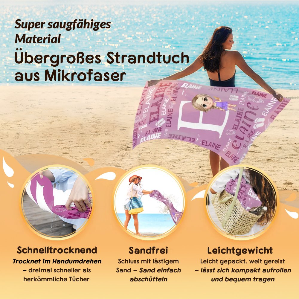 Dieses Strandtuch zeigt ein fröhliches Cartoon-Kindermotiv, das sofort ins Auge fällt und besonders bei Kindern gut ankommt. Die große Initiale bildet den visuellen Mittelpunkt und wird durch den Allover-Druck des Namens Ihres Kindes ergänzt, wodurch ein persönlicher und unverwechselbarer Look entsteht. Sommerliche Details wie Strandsandalen, Eiscreme und Möwen verleihen dem Design eine leichte, fröhliche Atmosphäre und machen das Strandtuch zu einem echten Hingucker am Strand.
