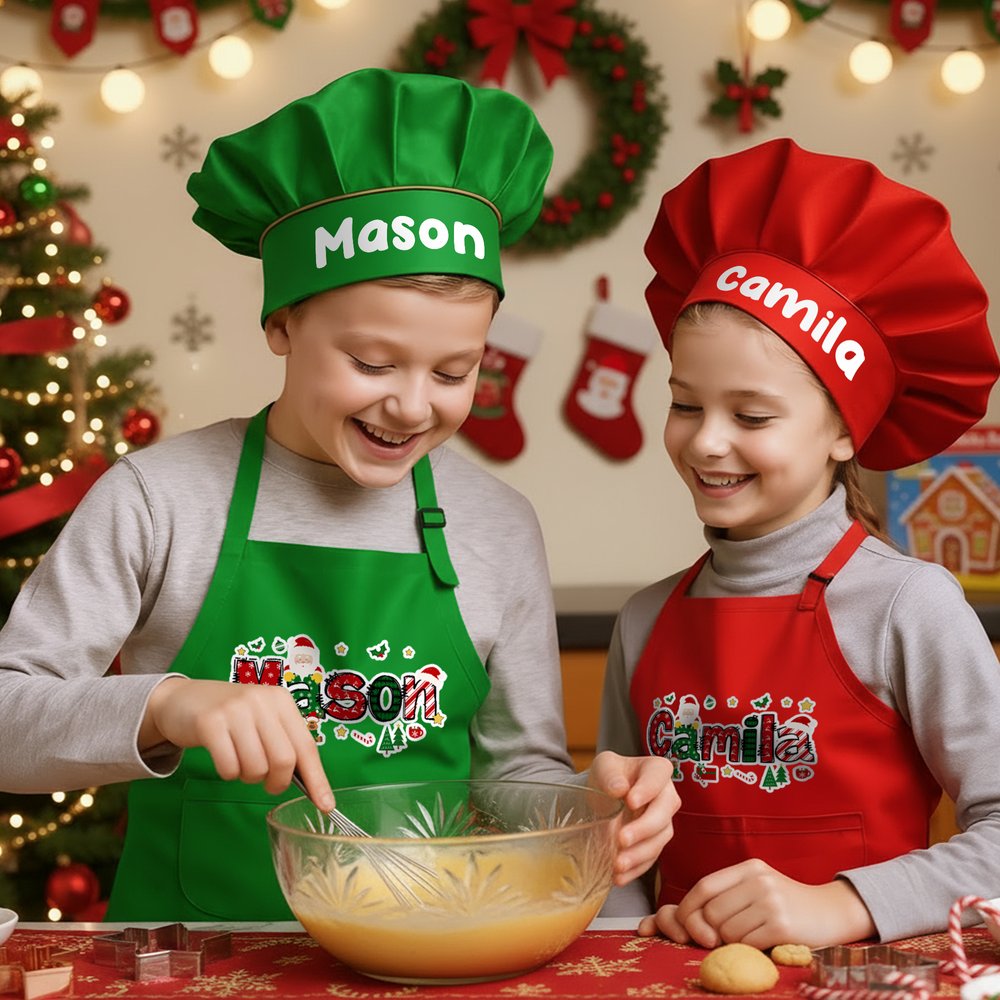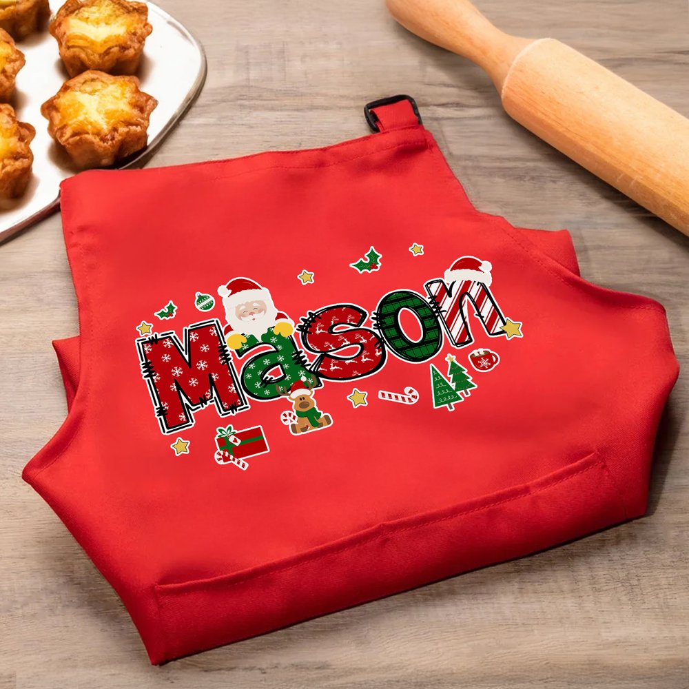 Dieses weihnachtliche Schürzenset ist mit einem niedlichen Cartoon-Weihnachtsmann und festlichen Namensmotiven versehen, die für einen verspielten und charmanten Stil sorgen. Jede Schürze kann mit dem Namen des Kindes personalisiert werden, so dass jeder kleine Koch eine einzigartige Schürze für sich hat. Dieses unverwechselbare Design zieht nicht nur die Aufmerksamkeit der Kinder auf sich, sondern lässt sie auch ein besonderes Gefühl von Stolz und Freude beim Kochen empfinden.