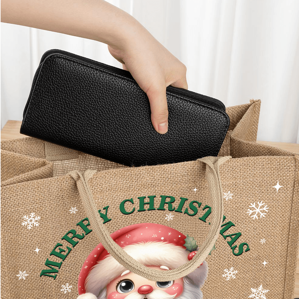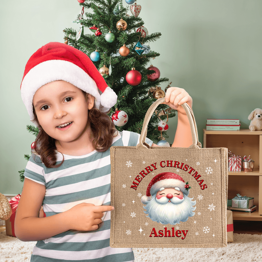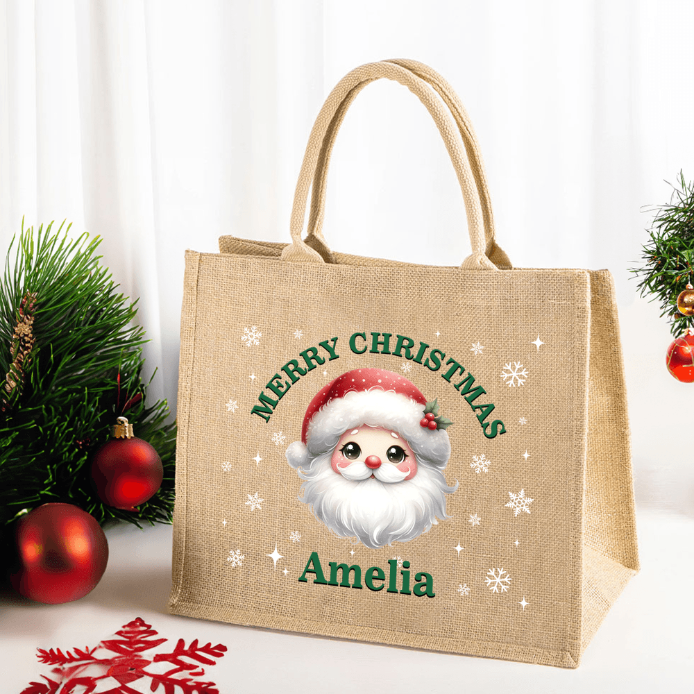 Das bezaubernde Weihnachtsmann-Muster erzeugt zusammen mit dem Text "MERRY CHRISTMAS" und den Schneeflocken eine warme und fröhliche Weihnachtsstimmung. Du kannst außerdem aus 4 Schriftfarben wie Schwarz, Grün, Rot und Weiß wählen und einen Namen eingeben. So können Sie eine einzigartige Tragetasche voller Weihnachtsstimmung und persönlicher Bedeutung gestalten.