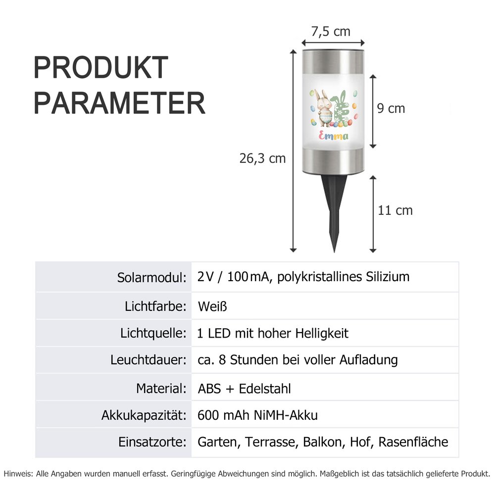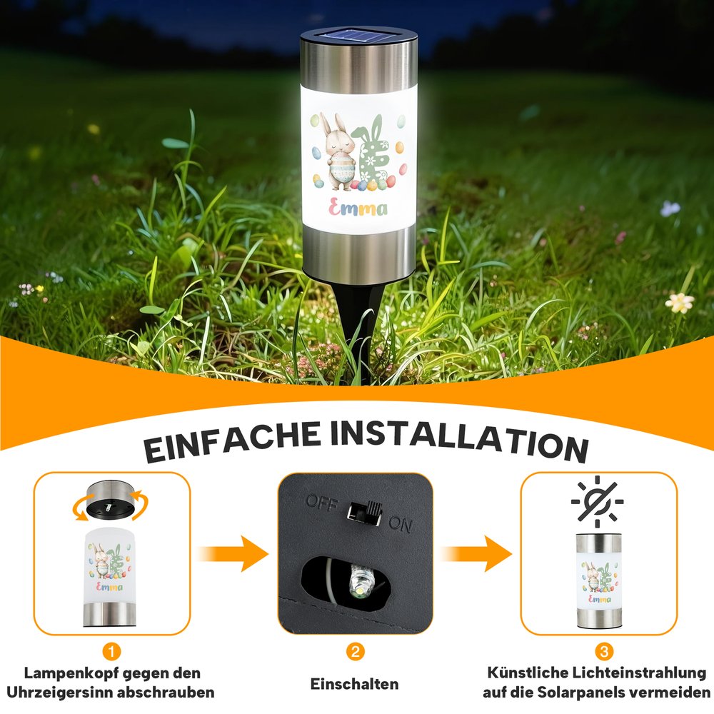 Mit liebevollen Elementen wie Hasen und Ostereiern verkörpert dieses Gartenlicht den warmen und niedlichen Geist von Ostern. Dank individueller Personalisierungsoptionen für Namen, Ostermotive und Texte wird es zu einem einzigartigen Stück, das Ihre persönlichen Gefühle widerspiegelt. Das lebendige Design schafft sofort eine fröhliche Festtagsatmosphäre und macht diese Leuchte zu einer charmanten Ergänzung Ihrer Osterdekoration.