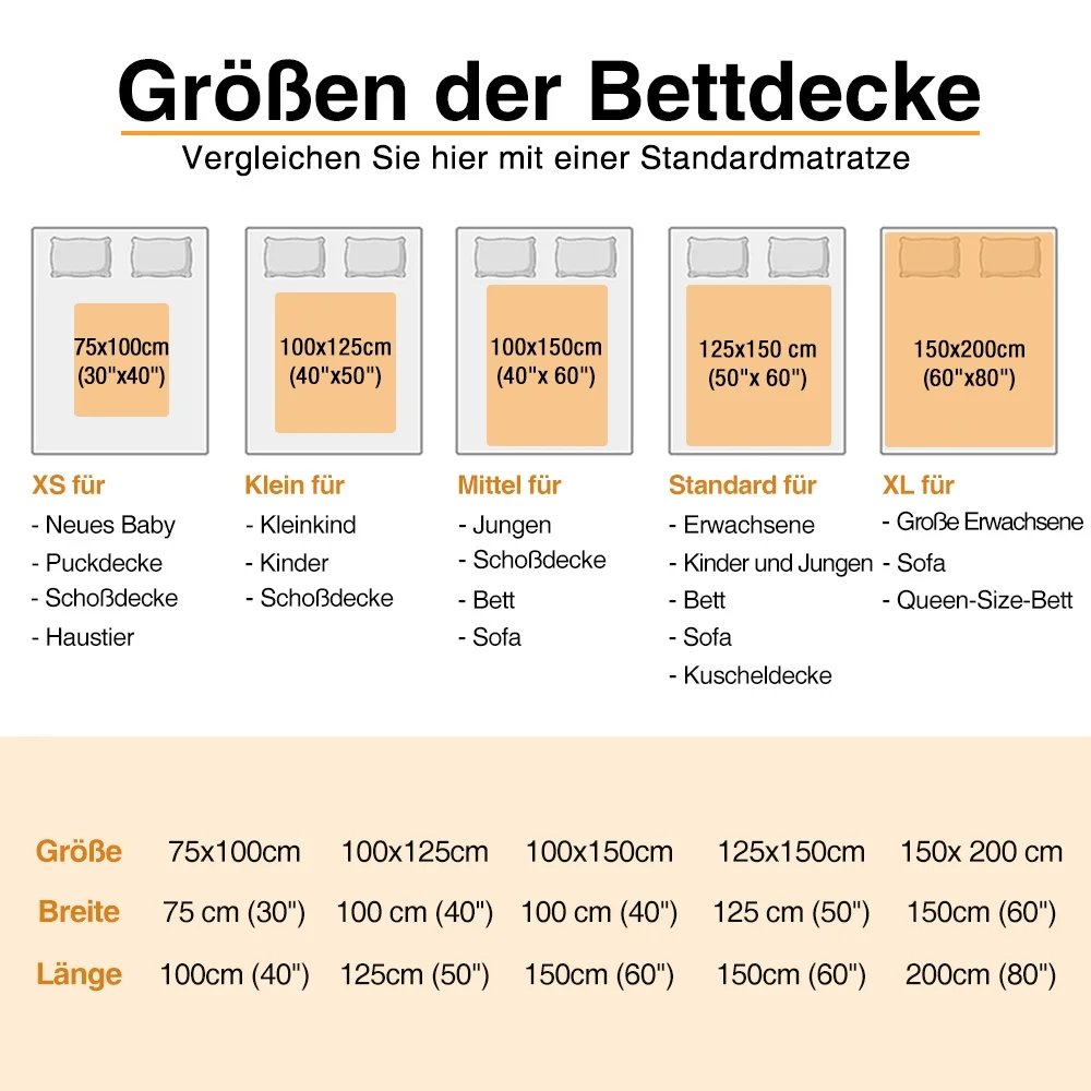 | Größe: | Fleece-Decke: 75cm x 100cm (30" x 40"), 100cm x 125cm (40" x 50"), 100cm x 150cm (40" x 60"), 125cm x 150cm (50" x 60"), 150cm x 200cm (60" x 80"), Sherpa-Decke: 100cm x 125cm (40" x 50"), Sherpa-Decke: 125cm x 150cm (50" x 60"), Sherpa-Decke: 150cm x 200cm (60" x 80") |