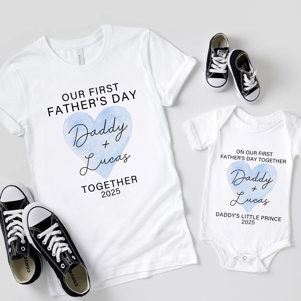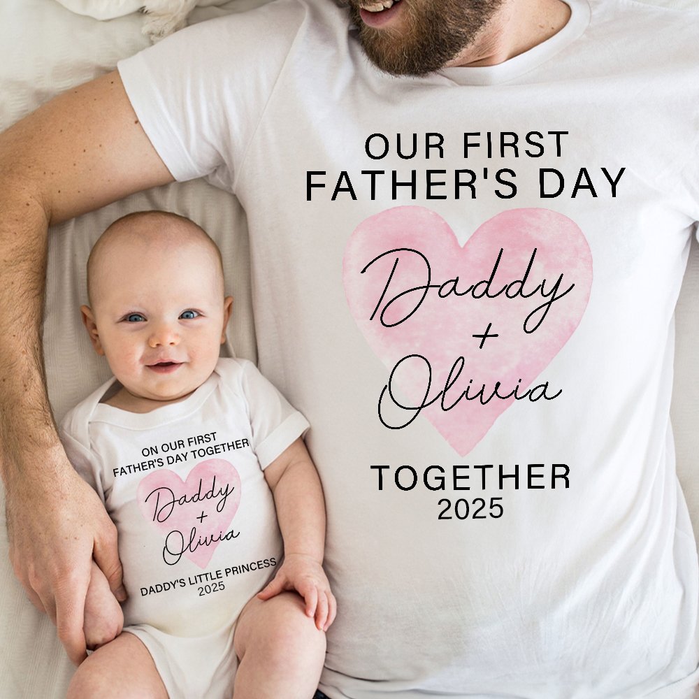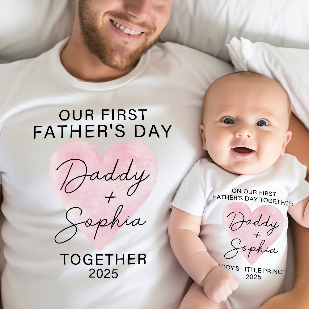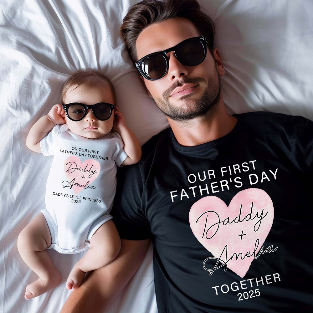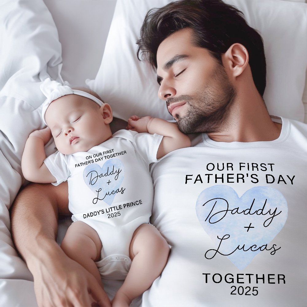 Passendes Baby-Vater-Set, bedruckt mit den warmen Worten "OUR FIRST FATHER'S DAY TOGETHER", die die untrennbare Beziehung zwischen Vater und Baby symbolisieren und die warme Eltern-Kind-Zeit zeigen. Es gibt zwei Stile - rosa Herz und blaues Herz - zur Auswahl, und Sie können auch den Namen des Kindes und des Vaters auf die Kleidung drucken, um sie noch einzigartiger zu machen.