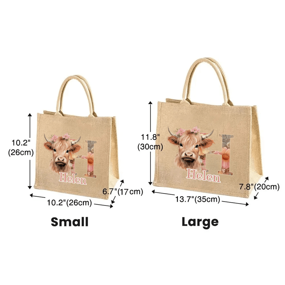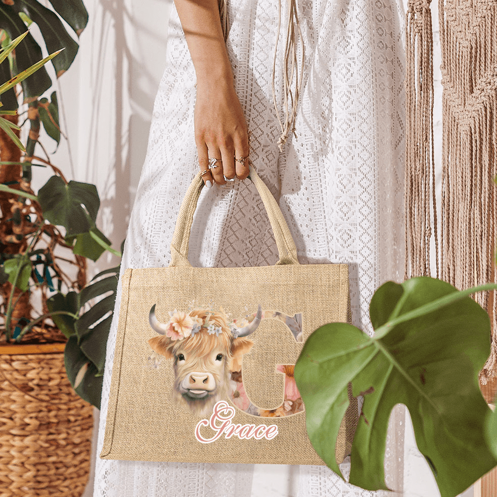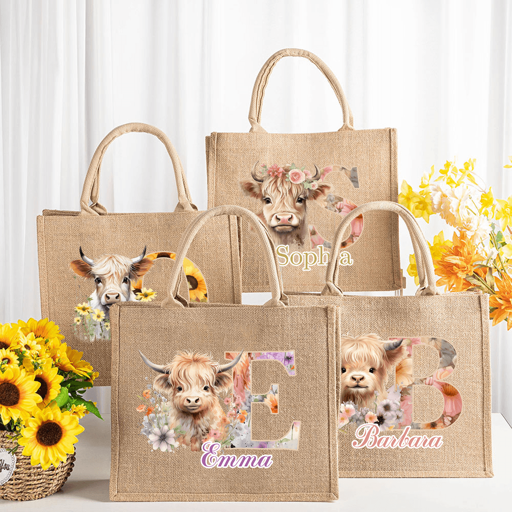 Die Tasche zeigt ein elegantes Hochlandkuh-Muster und frische Blumenelemente, die einen natürlichen, rustikalen Charme ausstrahlen. Außerdem lässt sich der Schriftzug und der Name personalisieren, wodurch sich der Jutebeutel von einem praktischen Accessoire in ein "persönliches Emblem" verwandelt.