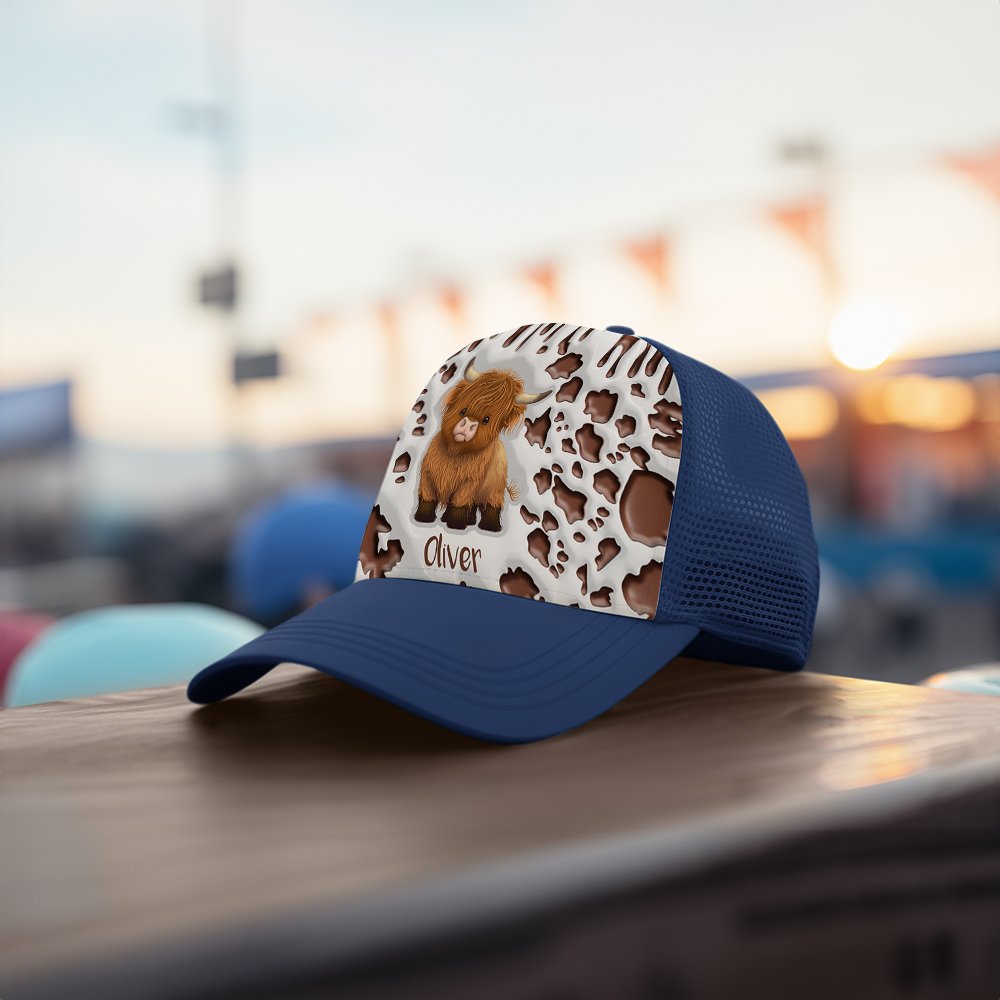 Dieser Hut zeigt eine niedliche Hochlandkuh als Designelement mit einem lustigen Schokoladenfleckenmuster, das in der Sonne noch mehr glänzt. Du kannst ihn auch mit deinem Namen versehen, um diesen Hut einzigartig und zu einem begehrten Gegenstand zu machen, der deine Liebe für Sport und Hochlandkühe perfekt zum Ausdruck bringt.