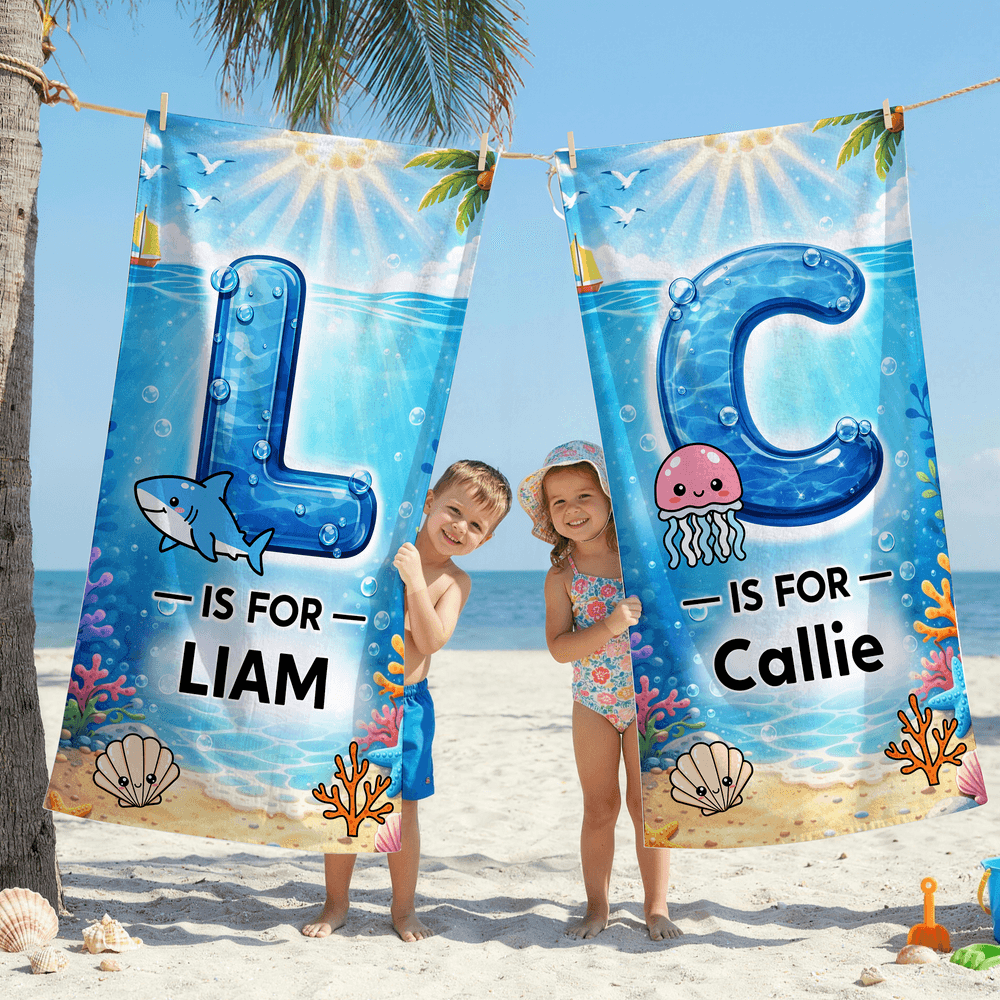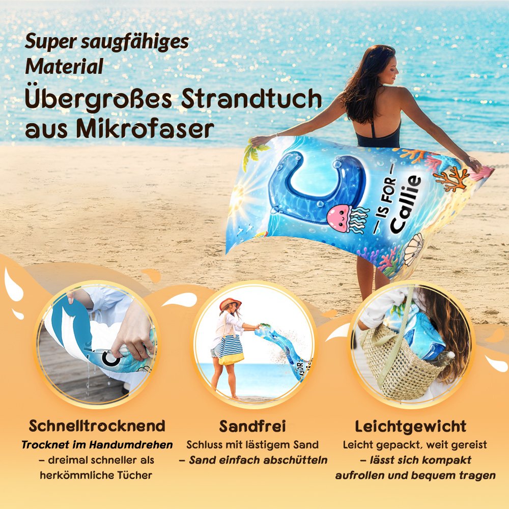 Personalisiertes Strandtuch mit Wassereffekt-Initiale | Meerestiermotiv | in Übergröße erhältlich | Sommerausflug Geburtstag Geschenk für Kinder