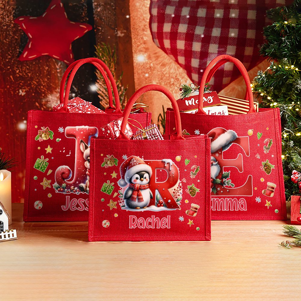 Die Tragetasche enthält weihnachtliche Cartoon-Pinguine, Rentiere, Lebkuchenmänner, Schneemänner, den Weihnachtsmann und weihnachtliche Initialen, die ein lebendiges und bezauberndes Design mit leuchtenden roten und grünen Weihnachtsfarben schaffen. Die anpassbare Cartoon-Figur und der Name verleihen der Tasche eine persönliche und festliche Note. Ob als Geschenk oder für den täglichen Gebrauch, die Tasche vermittelt sofort Weihnachtsgrüße und wird zu einem auffälligen optischen Blickfang während der Feiertage.