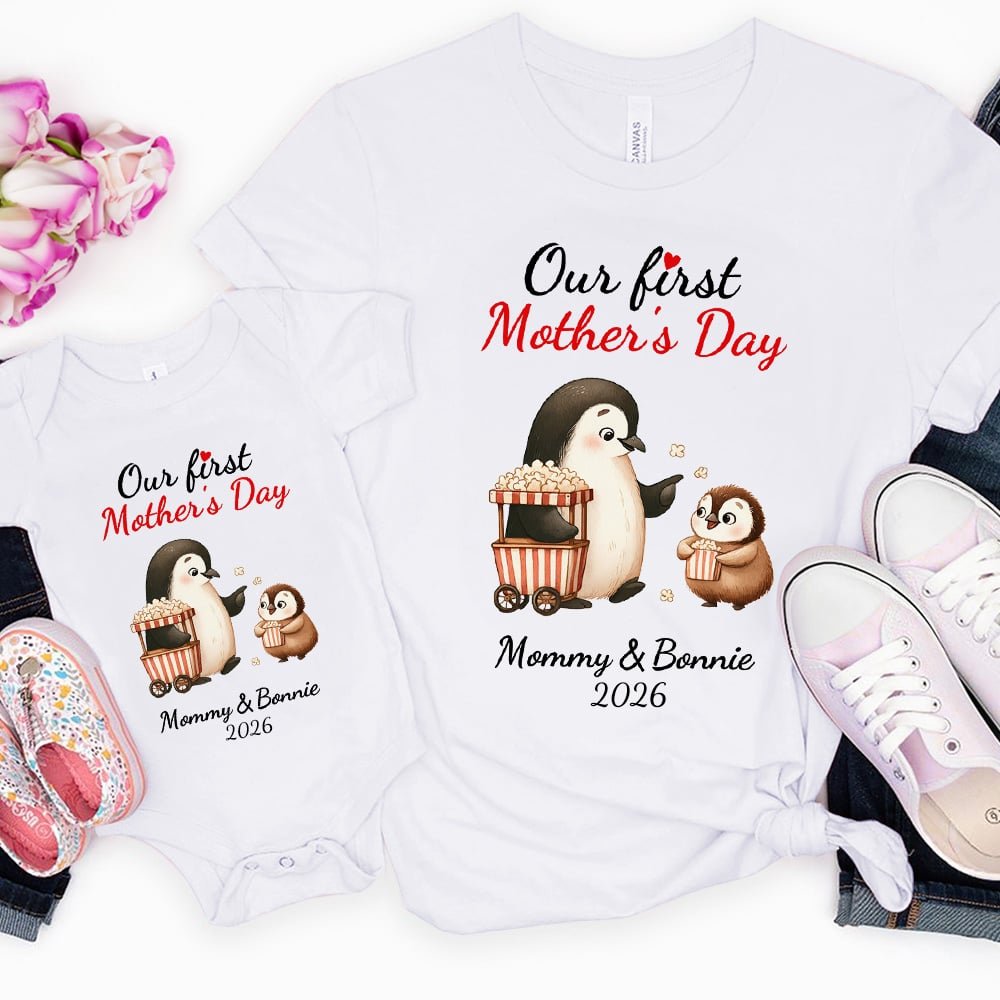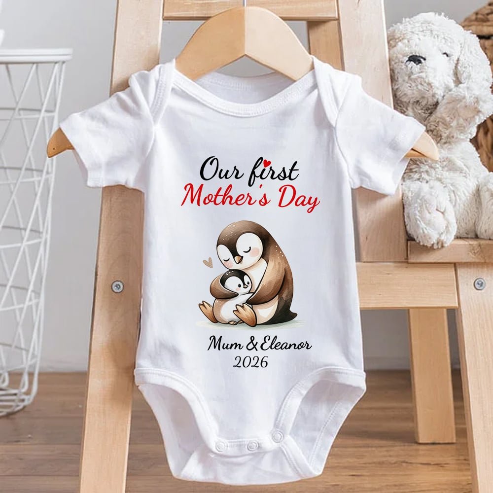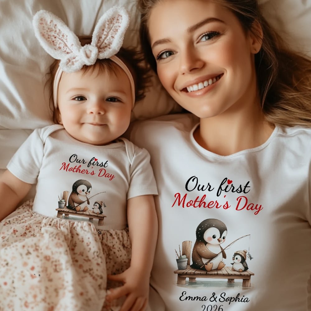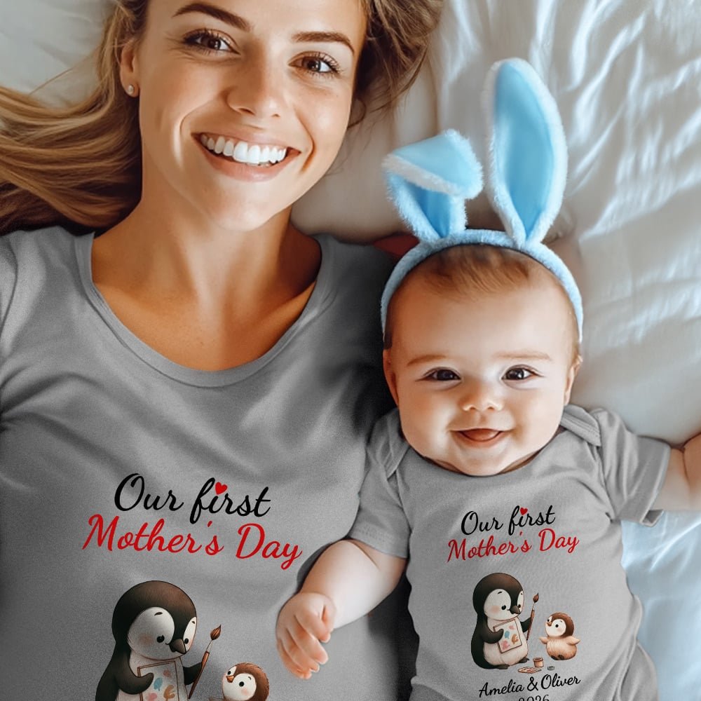 Einzigartiges Design, voll von Niedlichkeit. Die Eltern-Kind-Bekleidungsserie "Our First Mother's Day" hat eine Vielzahl von niedlichen Pinguinmustern, jedes Muster ist voll von kindlichem Charme. Egal, ob es sich um den Body für das Baby oder das T-Shirt für die Mutter handelt, es kann sofort die Aufmerksamkeit der Leute auf sich ziehen und Sie und Ihr Baby aus der Masse herausstechen lassen.