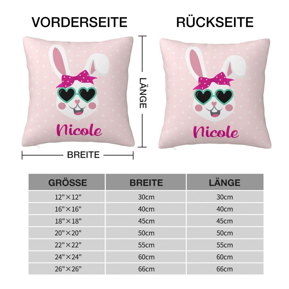 Dieser Kissenbezug mit dem niedlichen Kaninchen Design ist die perfekte Ergänzung für Ihre Osterdekoration. Er bietet Anpassungsmöglichkeiten für verschiedene Ausdrücke, Accessoires und sogar Schrift- und Hintergrundfarben. So können Sie flexibel einen individuellen Kissenbezug gestalten, der dem Stil und den Vorlieben Ihres Kindes entspricht.