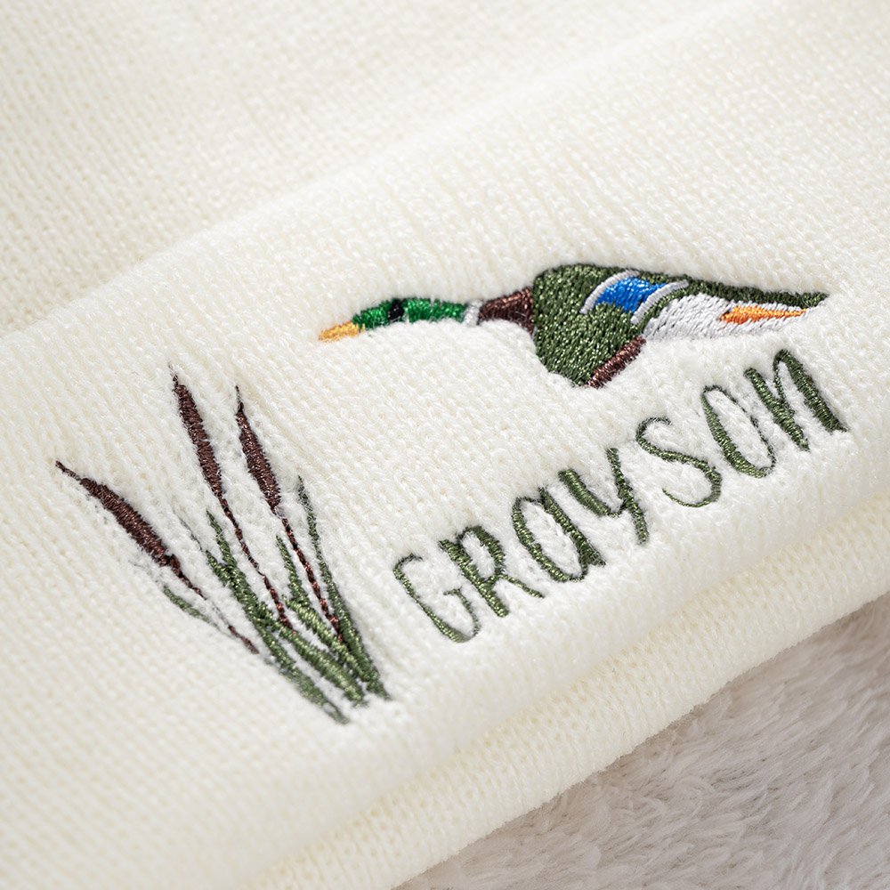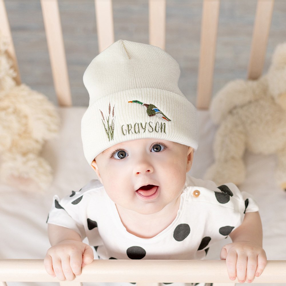 Die Babymütze ist mit Schilf und Stockenten bestickt, mit einem rein weißen Hintergrund, voller natürlicher und warmer Atmosphäre, die den Segen von Wachstum und Glück symbolisiert. Die Mütze kann auch mit dem Namen des Babys personalisiert werden, was sie zu einem einzigartigen und wertvollen exklusiven Artikel macht.