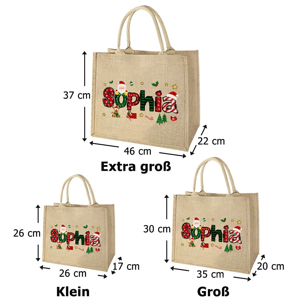 Diese Tragetasche begeistert mit liebevollen Motiven wie dem Weihnachtsmann, geschmückten Tannenbäumen und verspielten Buchstaben, die die festliche Stimmung der Jahreszeit wunderbar einfangen. Auf Wunsch können Sie die Tasche mit einem Namen personalisieren, wodurch sie zu einem besonderen und durchdachten Geschenk für jeden auf Ihrer Geschenkliste wird.