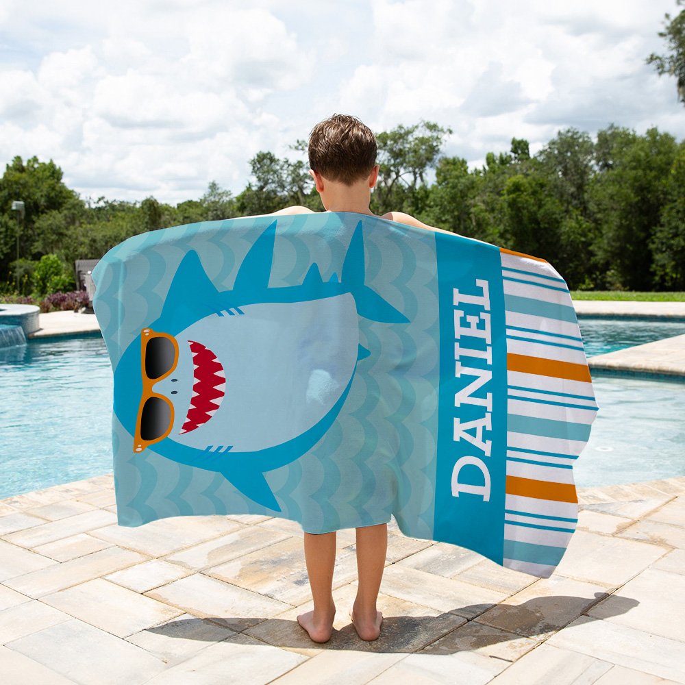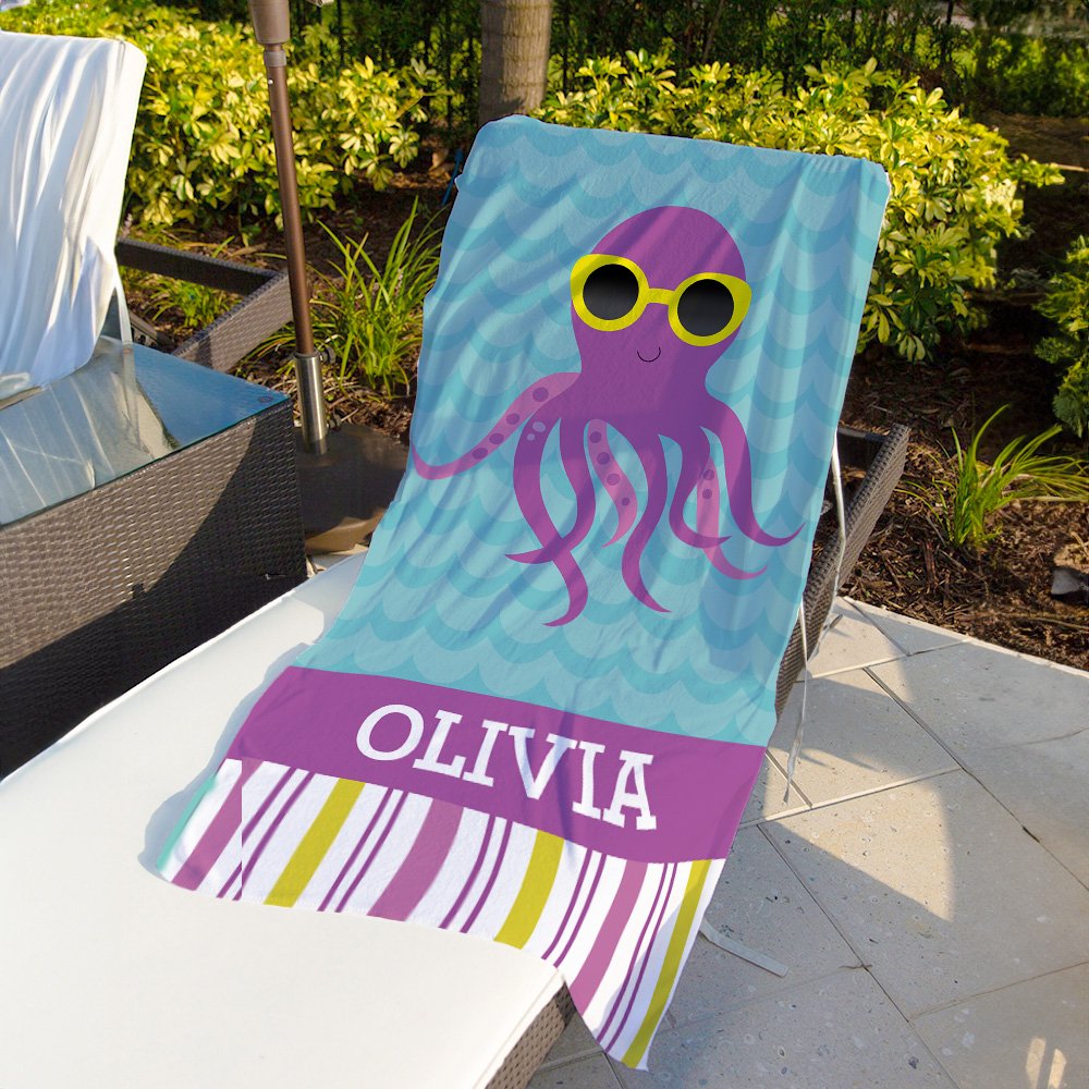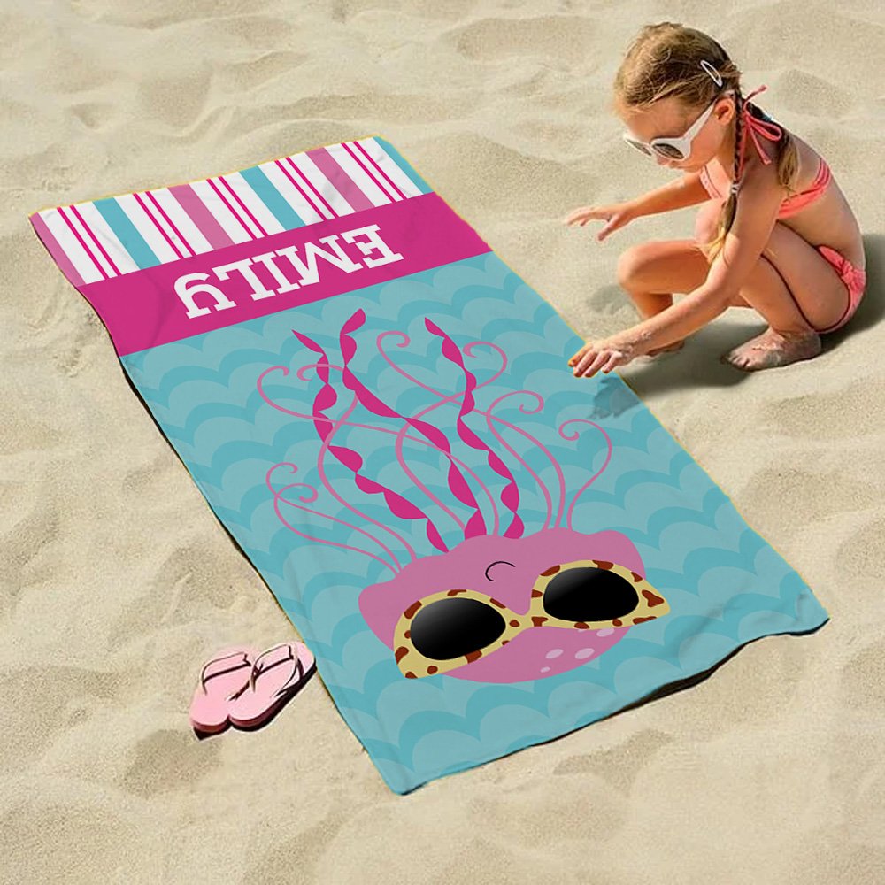 Das Design dieses Strandtuchs ist von niedlichen Meeresbewohnern mit Sonnenbrillen inspiriert, mit Hai-, Kraken-, Seepferdchen- und Quallenmustern sowie klassischen Streifen, die den ganzen Strand in einen Spielplatz verwandeln. Die spielerischen Ausdrücke von Meeresbewohnern und die persönliche Namensanpassung werden sicherlich dazu führen, dass Kinder es lieben und es zu einem unverzichtbaren Teil ihrer Strandausrüstung machen.