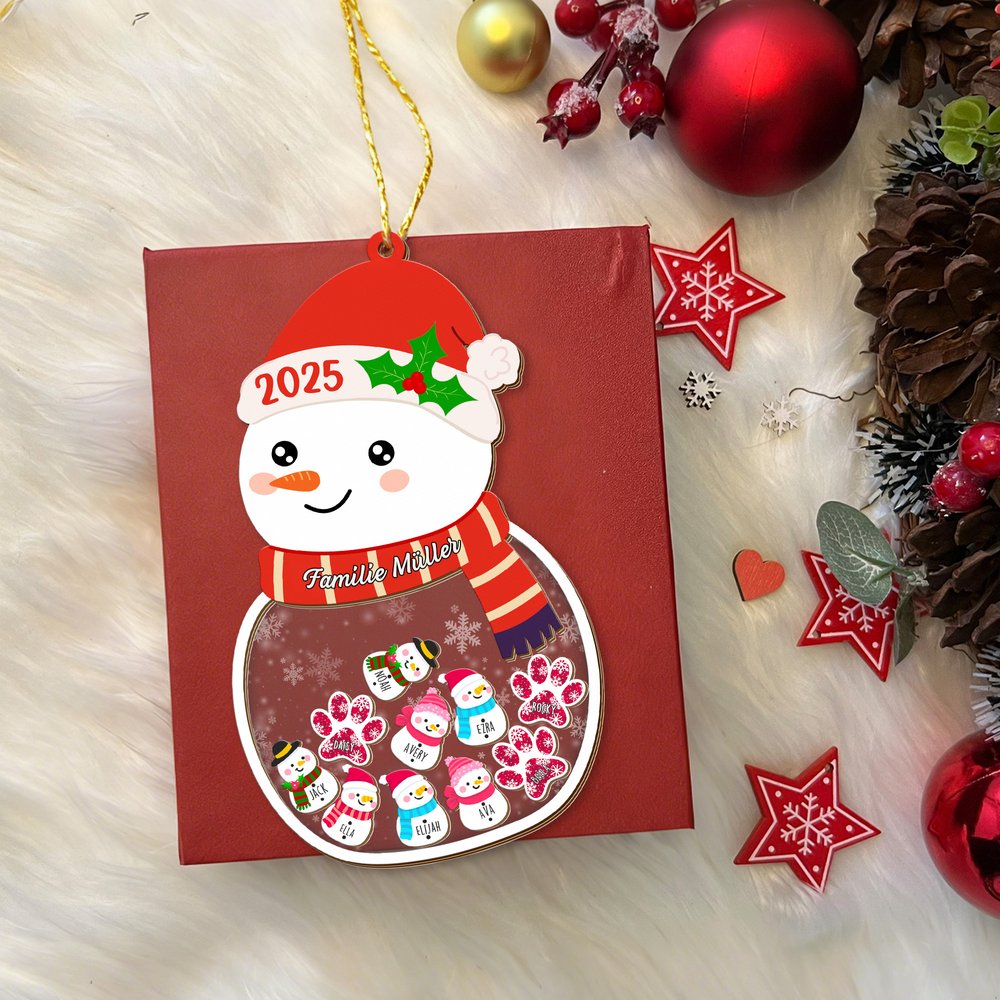 Feiern Sie die festliche Jahreszeit mit unserem bezaubernden Schüttel-Weihnachtsornament! Dieses liebevoll gestaltete Ornament enthält mehrere kleine Anhänger in Form von fröhlichen Schneemännern oder niedlichen Hundepfoten. Das Besondere daran ist der charmante Schütteleffekt, der für funkelnde Weihnachtsstimmung sorgt. Auf Wunsch kann das Ornament mit 1 bis 13 Namen, Jahreszahlen oder einem persönlichen Text individualisiert werden. Es ist eine ganz besondere Ergänzung Ihrer festlichen Dekoration und ein wunderbares Geschenk für Ihre Liebsten.