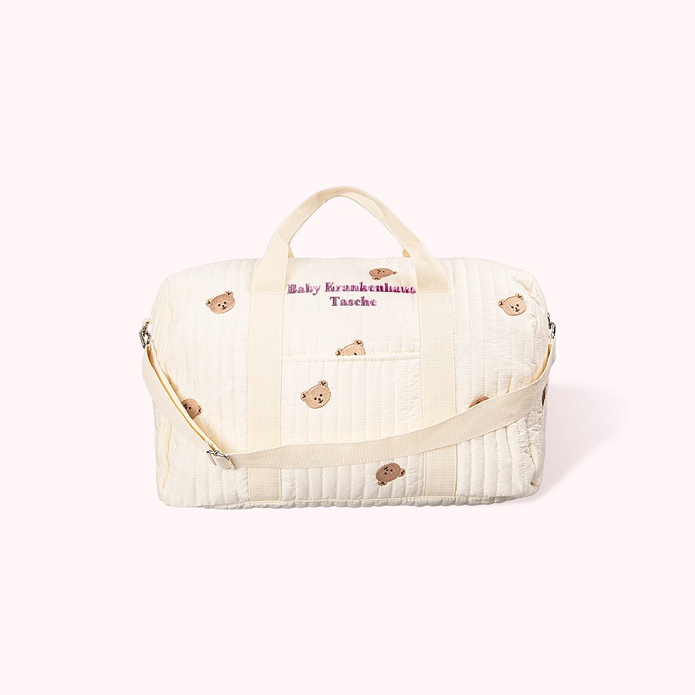 Diese Baby-Krankenhaustasche ist mit niedlichen Stickereien von Hasen, Bären oder Olivenblättern verziert, die ihr einen süßen und skurrilen Touch verleihen. Die aufwendige Stickerei zeigt die Liebe zum Detail und macht sie zu einem entzückenden Accessoire für die werdende Mutter.