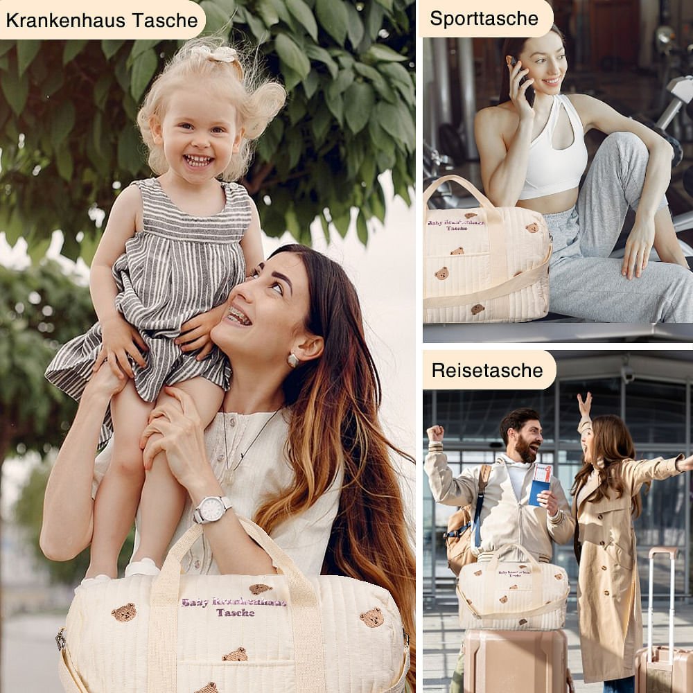 Die Tasche verfügt über ein großes Fassungsvermögen, darunter ein großes Hauptfach, eine Außentasche und mehrere Innentaschen. Sie bietet eine bequeme Organisation für Gegenstände wie Windeln, Flaschen und Kleidung und ist damit die ideale Wahl für werdende Mütter als Umstandstasche oder für Ausflüge als Mamatasche oder Babykrankenhaustasche.