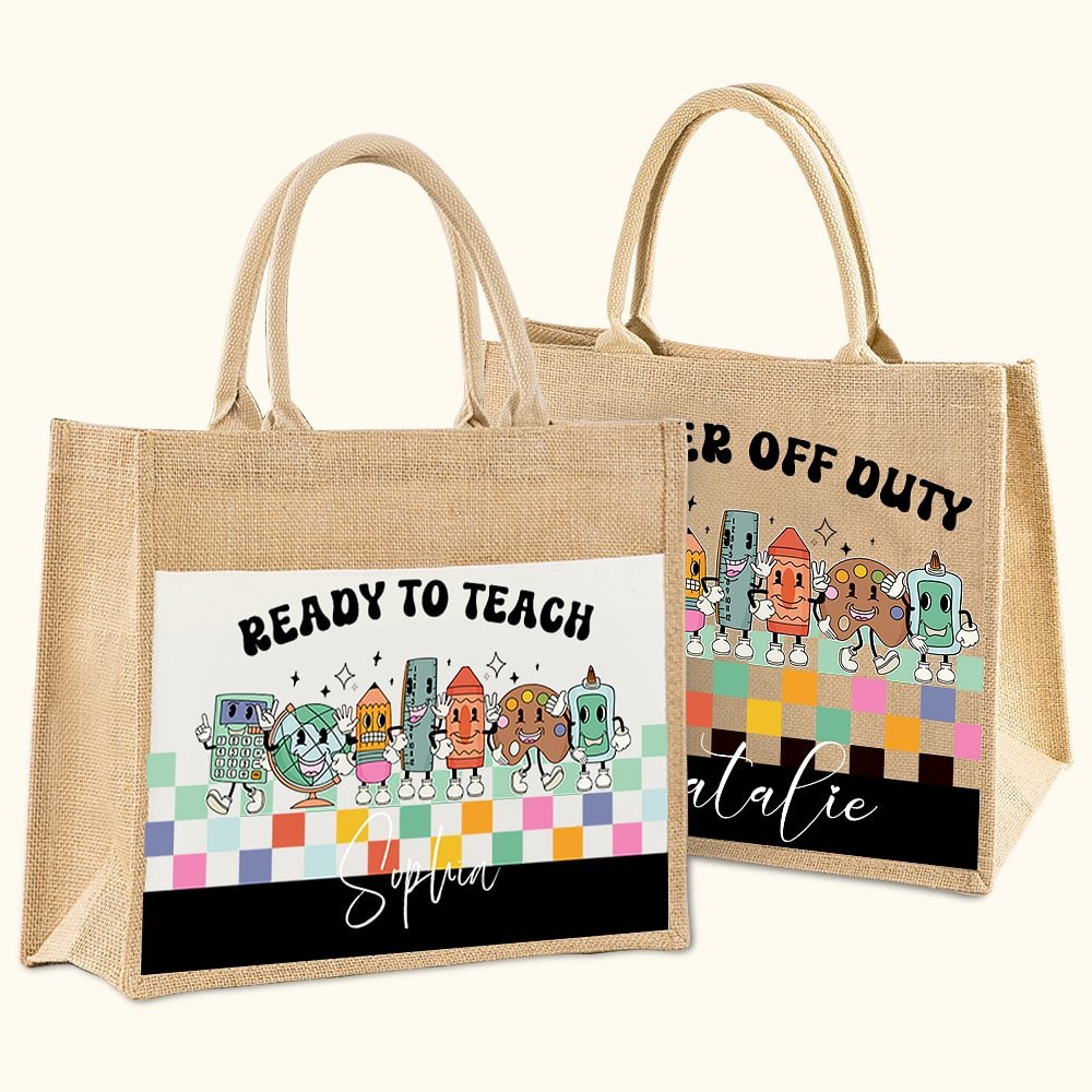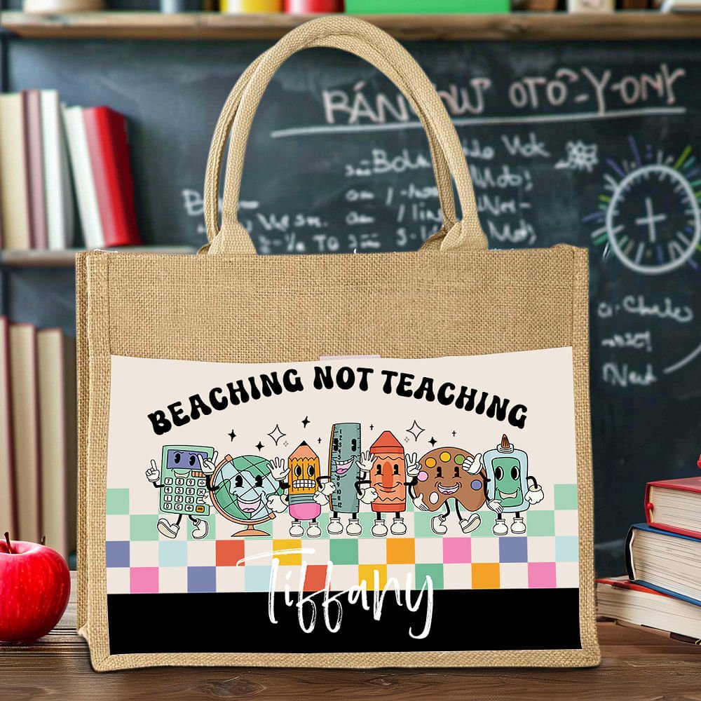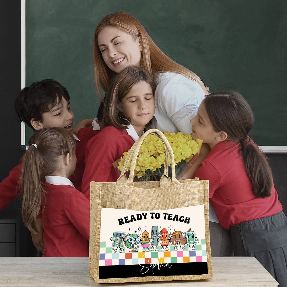 Diese Tragetasche ist mit einem Computer, einem Globus, einem Buntstift, einem Bleistift und einer Farbpalette verziert und verleiht der Lehrertasche einen verspielten Touch. Gestalten Sie die Tasche mit dem Namen des Lehrers, um ein einzigartiges und besonderes Geschenk zu schaffen, das seine Individualität unterstreicht.