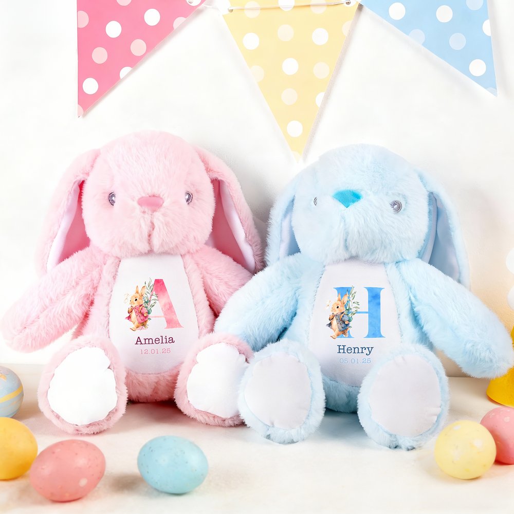 Mit einem erfrischenden Cartoon-Kaninchendesign in Aquarelltechnik kann jedes Stück mit den Initialen und dem Namen Ihres Kindes individuell gestaltet werden. Der sanfte und beruhigende Stil ist sowohl niedlich als auch individuell und gibt Ihrem Kind einen einzigartigen Begleiter für die Kindheit.