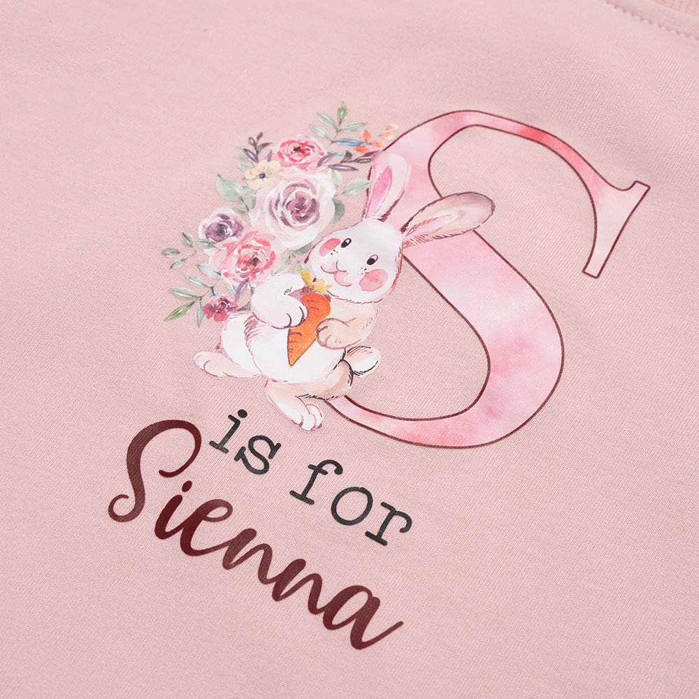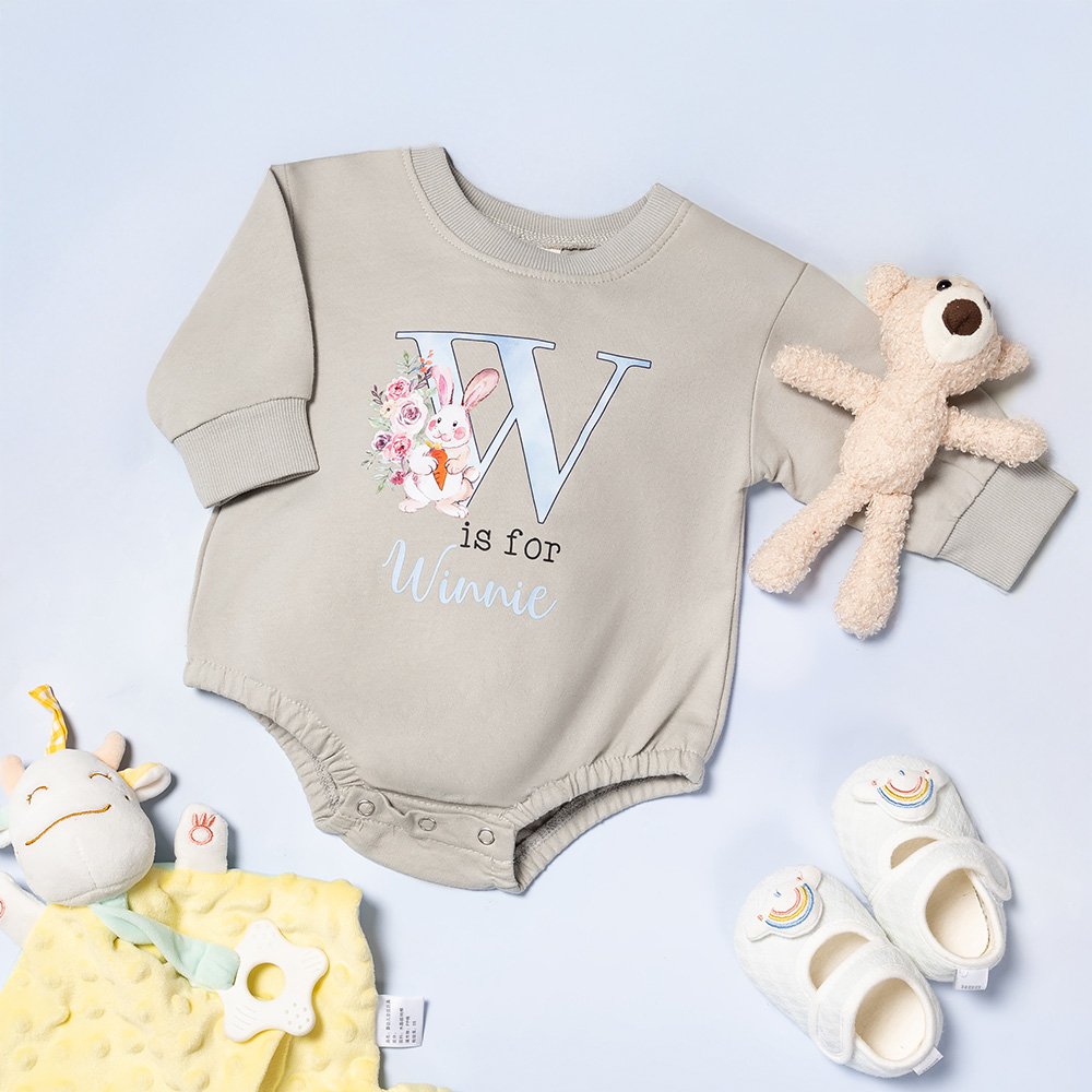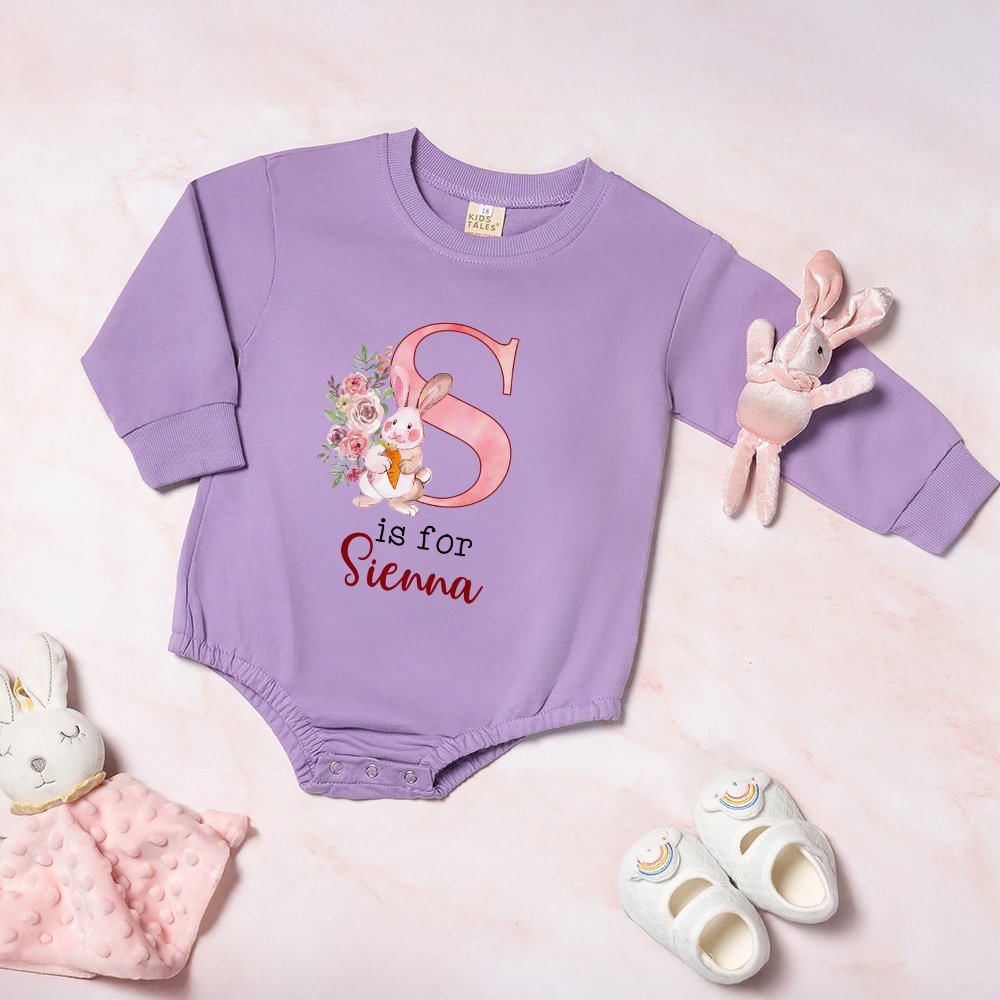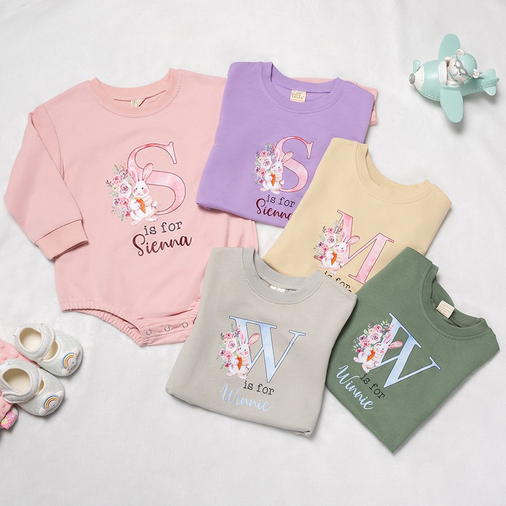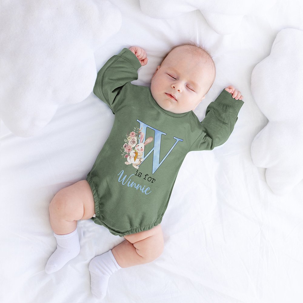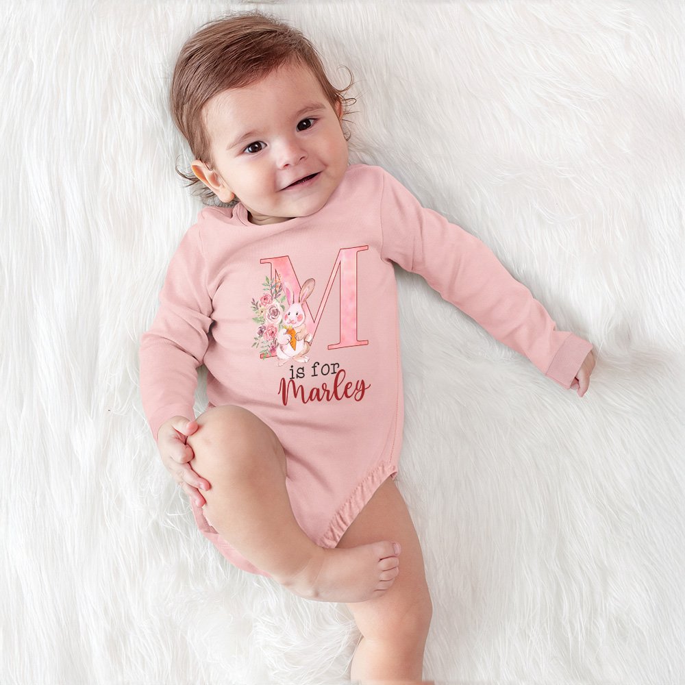 Dieser Body hat ein niedliches, unschuldiges Aquarellhasendesign mit Blumenverzierungen. Sie können auch Ihren Namen und Ihre Initialen personalisieren, um ein einzigartiges Outfit für Ihr Kind zu kreieren.