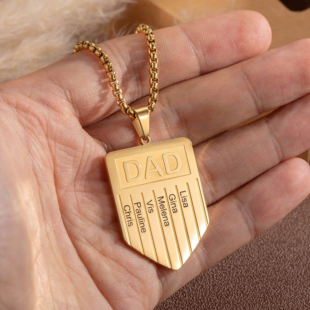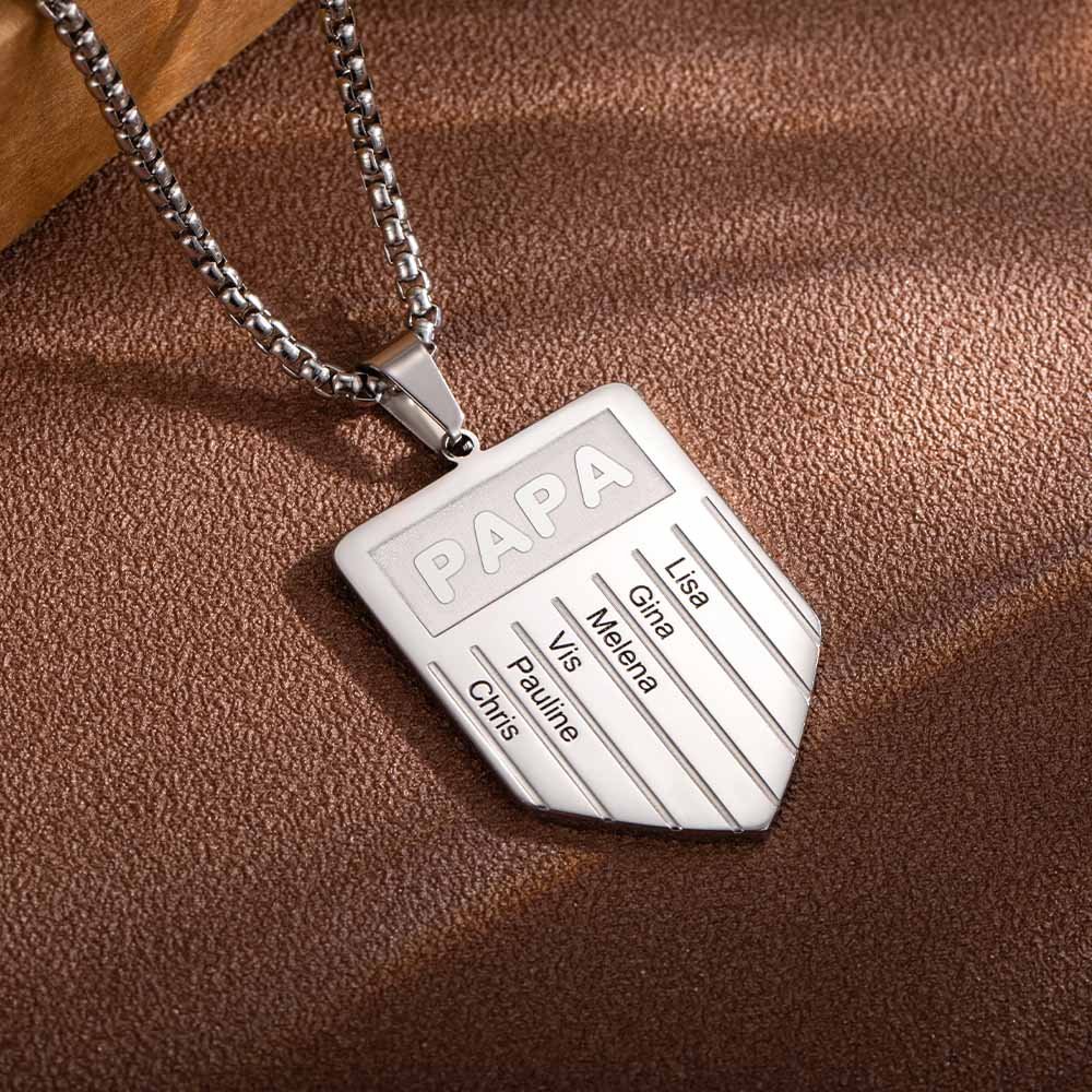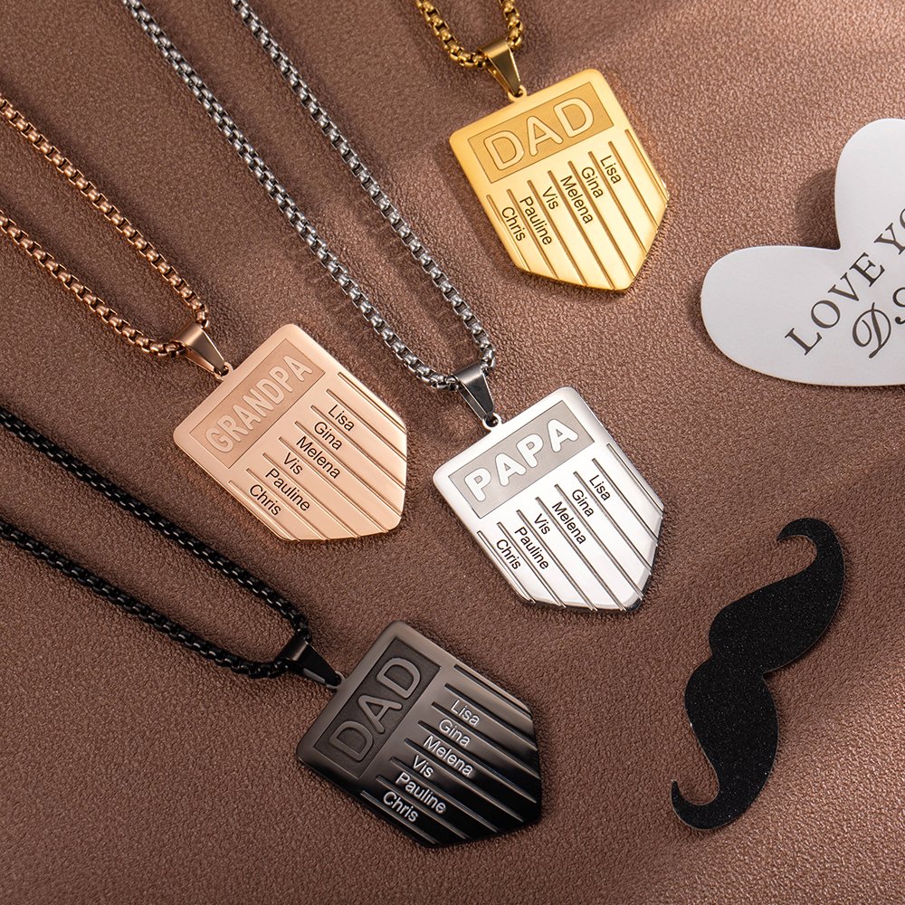 Diese Halskette ist ein zeitloses Accessoire, das die Bindung zwischen Vater und Kind zelebriert. Das Design der Halskette ist einzigartig, und der Name des Kindes kann sorgfältig auf dem Anhänger eingraviert werden, was sehr bedeutungsvoll ist.
