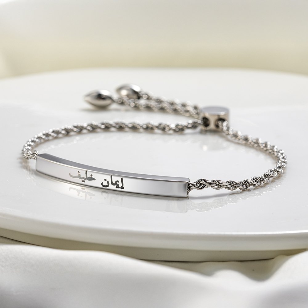 Dieses personalisierte exquisite arabische Gleitarmband ist ein Meisterwerk des Designs. Das Design kombiniert perfekt traditionelle islamische Ästhetik mit zeitgenössischer Mode. Das Design der Seilkette und kann mit arabischen Schriftmustern angepasst werden, um ein visuell atemberaubendes Stück zu schaffen, das zu jeder Gelegenheit getragen werden kann.