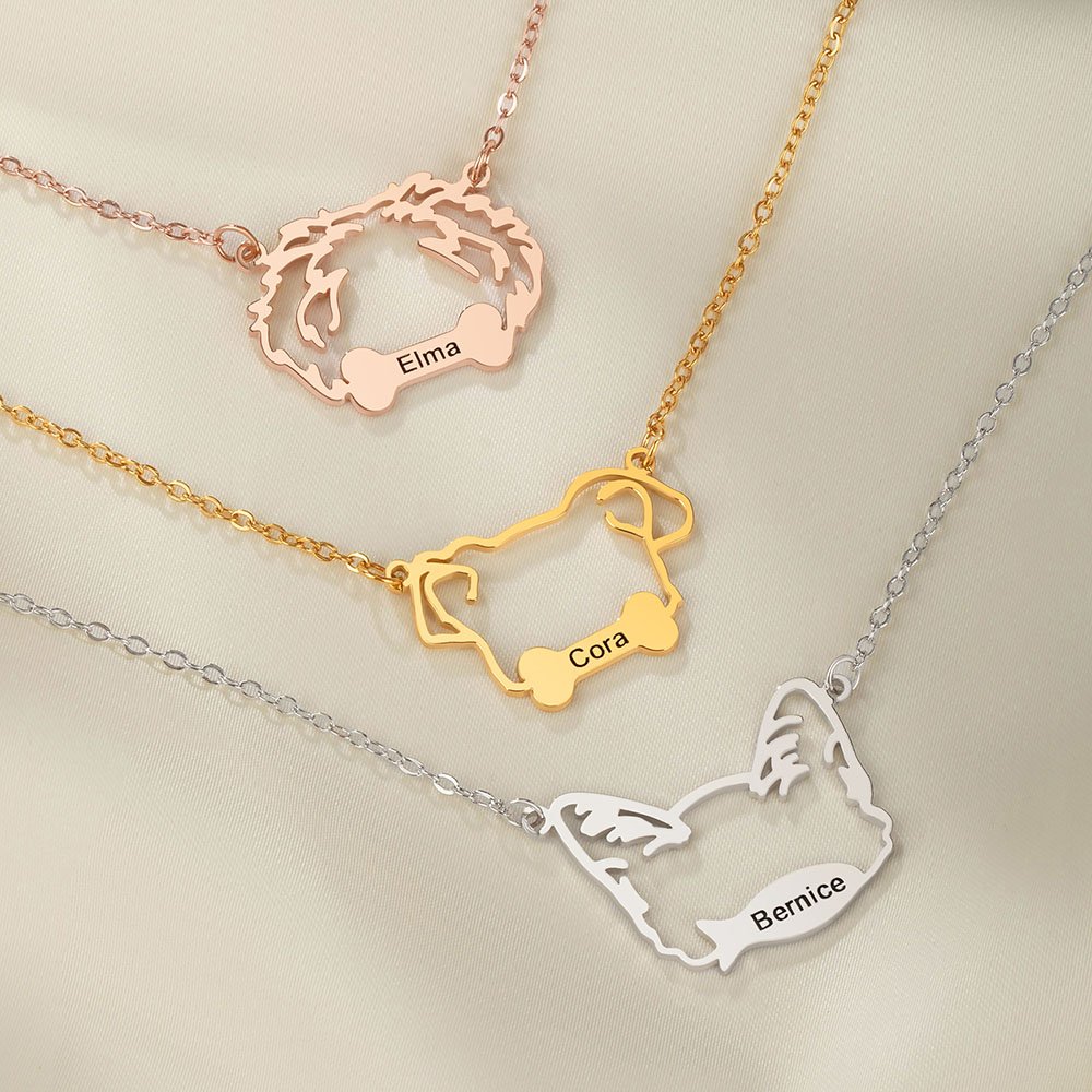 Die Halskette zeichnet sich durch ein einzigartiges Design aus, bei dem der Umriss eines geliebten Haustieres, sei es ein Hund oder eine Katze, in ein zartes Schmuckstück eingearbeitet ist. Die niedlichen Ohren verleihen dem Schmuckstück zusätzlichen Charme und machen es zu einem einzigartigen Accessoire, das auffällt. Mit der Möglichkeit, sie mit einem Namen zu versehen, wird diese Halskette noch spezieller.