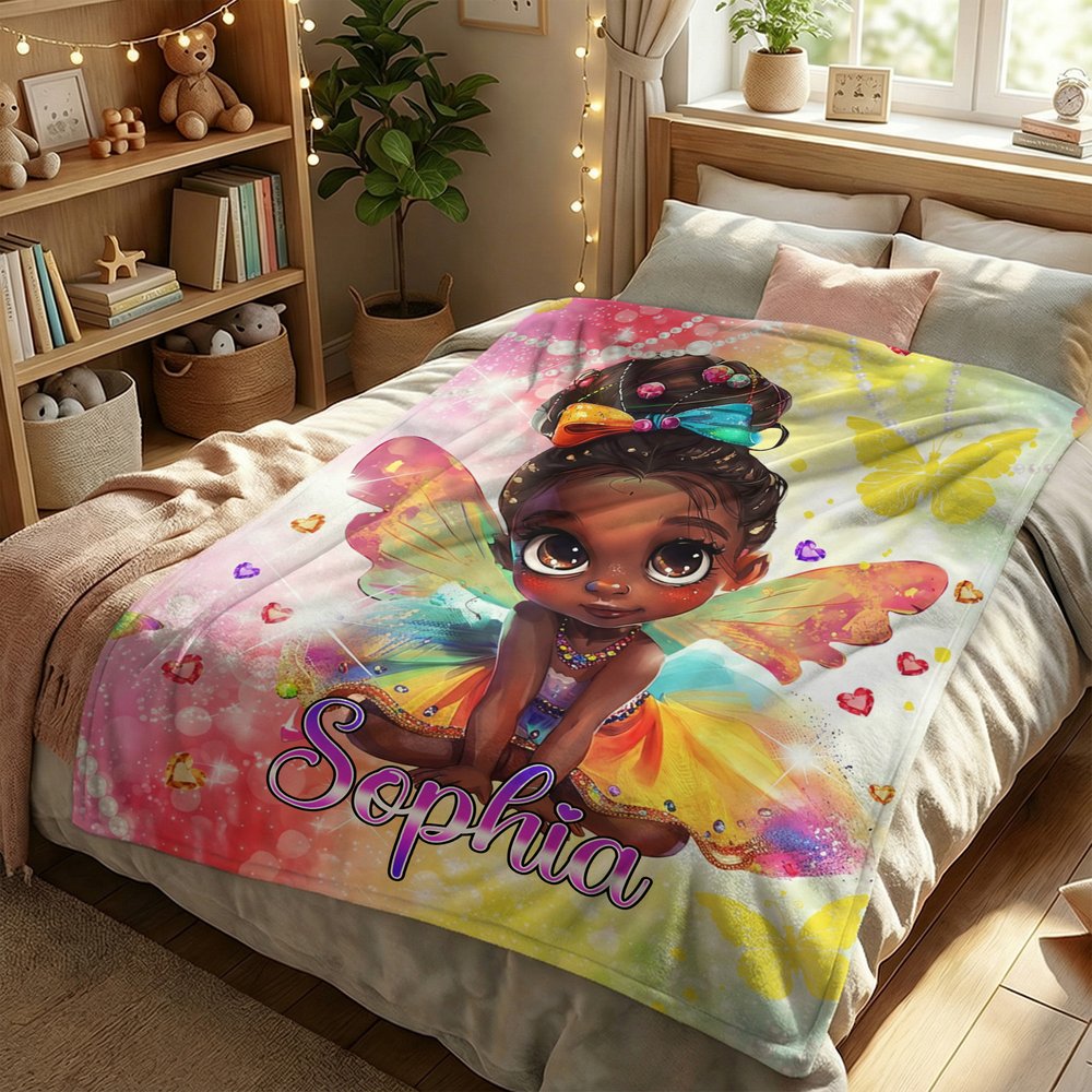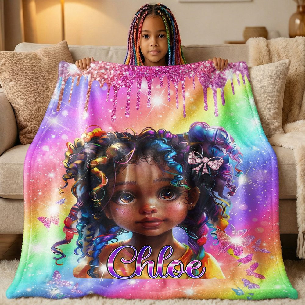 Diese lebendige Decke zeigt ein farbenfrohes, afroamerikanisches Mädchen mit Glitzerakzenten und einem regenbogenfarbenen Hintergrund, gepaart mit einem individuellen Namen in einer funkelnden Schriftart. Du kannst deinen Wunschnamen wählen, um das Design zu personalisieren und es in ein einzigartiges Accessoire zu verwandeln, das individuelle Identität und Stil zelebriert.