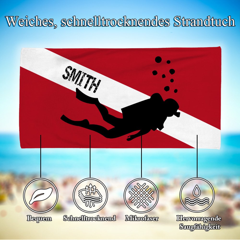 Unsere Strandtücher sind in den Farben der rot-weißen Taucherflagge gestaltet, die für Sicherheit und Bewusstsein steht. Sie zeigen die charakteristische Silhouette eines Tauchers, die Abenteuerlust und Entdeckungsfreude verkörpert und die Leidenschaft all jener einfängt, die die Faszination der Unterwasserwelt schätzen. Darüber hinaus ermöglicht die Personalisierung jedem Strandtuch eine individuelle Note und macht es zu einem einzigartigen Accessoire, das die Persönlichkeit seines Trägers auf besondere Weise zum Ausdruck bringt.