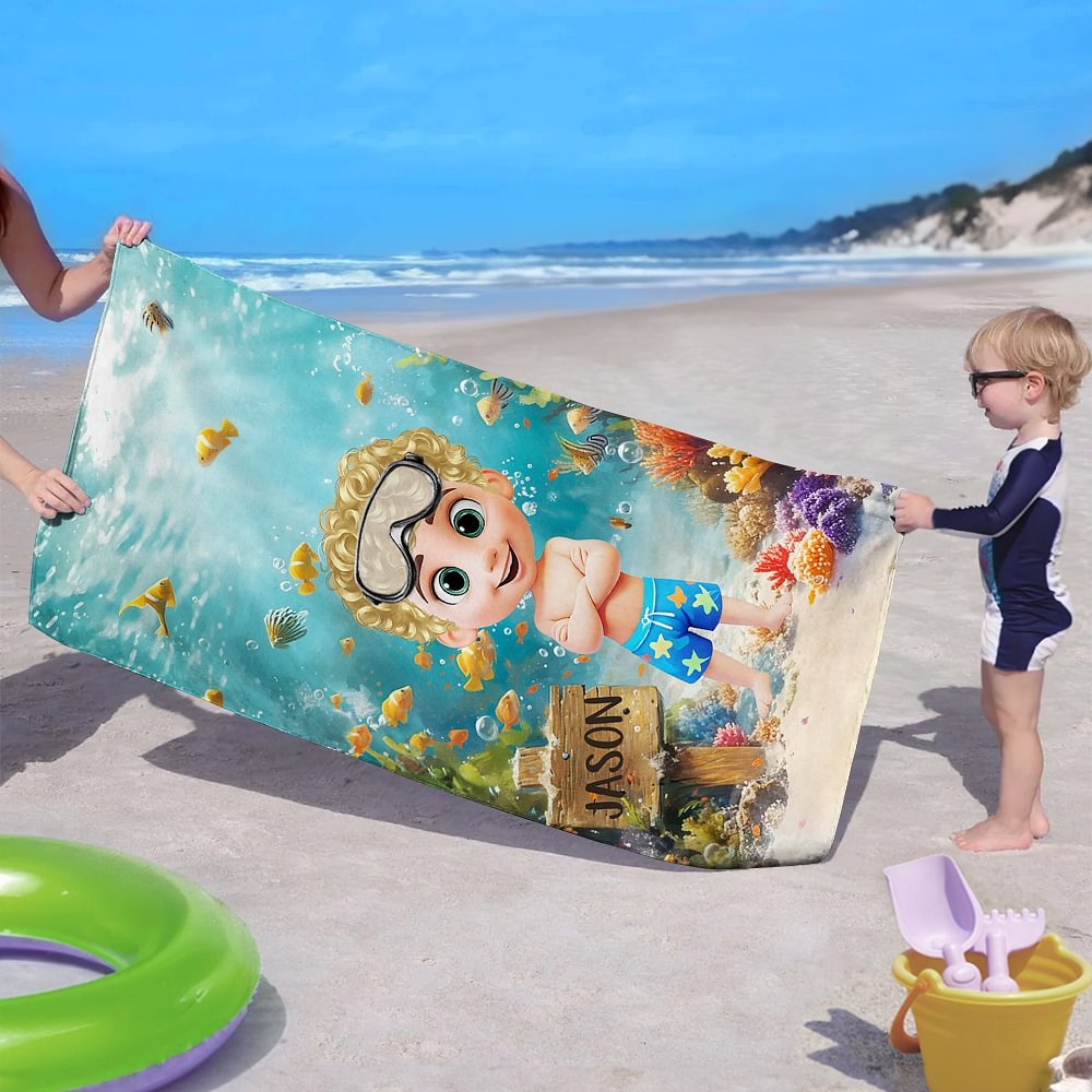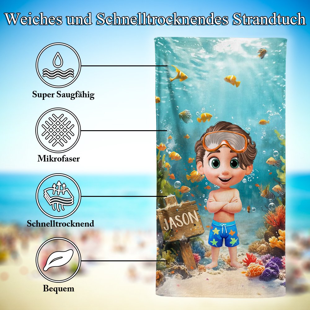 Dieses Strandtuch für Kinder bietet personalisierten Spaß! Sie können den Namen Ihres Kindes und einen Jungen- oder Mädchencharakter mit 3D-Cartoon-Motiven und einem Unterwasserwelt-Hintergrund gestalten. So entsteht ein einzigartiges Strandtuch, das die Kinder sofort als ihr eigenes erkennen werden und das den Strandtagen oder dem Bad eine besondere Note verleiht.