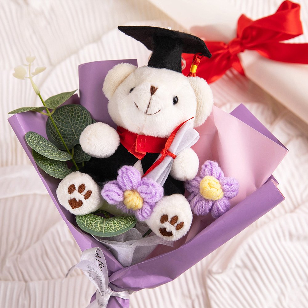 Diese Sträuße wurden speziell für Absolventen entworfen und vereinen den skurrilen Charme von Plüschbären mit der zeitlosen Eleganz von Strickblumen. Die Bärenfiguren, die Abschlusskappen und -roben tragen, vermitteln ein Gefühl von akademischem Stolz und Leistung. Gleichzeitig verleihen die umliegenden Blüten in leuchtenden Farbtönen und zarten Strukturen einen Hauch von Schönheit. Diese harmonische Verschmelzung von verspielten und raffinierten Elementen schafft ein wirklich fesselndes Bild, das den Geist der Abschlussfeier einfängt.