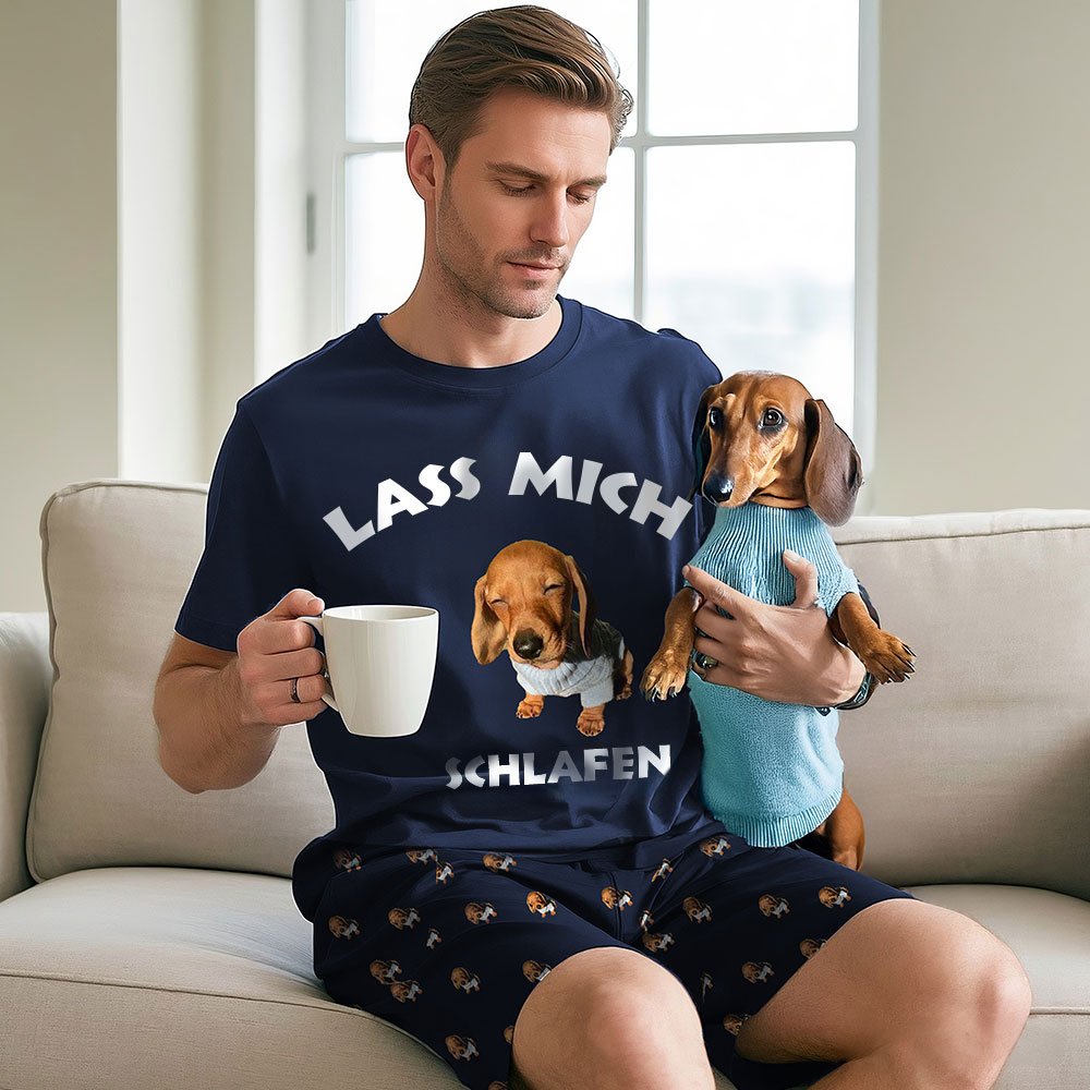 Unser Pyjama-Set besteht aus einem T-Shirt und Shorts und kann mit persönlichen Fotos gestaltet werden. Sie können das Bild Ihres Haustiers separat hochladen. So haben Sie Ihren tierischen Begleiter immer bei sich, ganz gleich ob beim Mittagsschlaf oder in der Nacht. Auf dem Oberteil kann zusätzlich ein Wunschtext ergänzt werden, der gemeinsam mit dem festen Schriftzug „SCHLAFEN“ eine entspannte, angenehme Atmosphäre schafft.