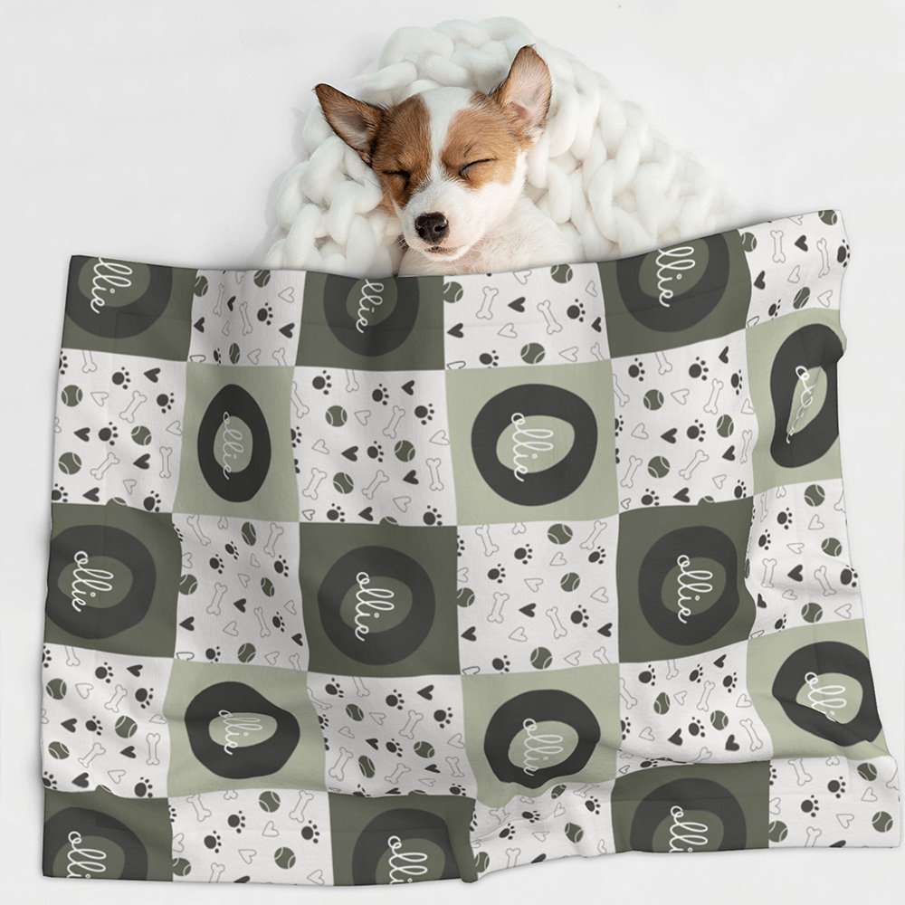 Das mehrfarbige Karomuster bildet einen lebendigen Hintergrund und verleiht der Decke einen stilvollen und modernen Look. Charmante Pfotenabdrücke, Herzen, Knochen und Bälle sind über die Decke verstreut - alles Symbole, die bei Tierliebhabern gut ankommen. Das Besondere an dieser Decke ist, dass sie mit dem Namen und den Initialen Ihres Haustiers versehen ist. Der Name Ihres pelzigen Freundes ist wunderschön in das Design integriert und macht die Decke zu einem echten Andenken.