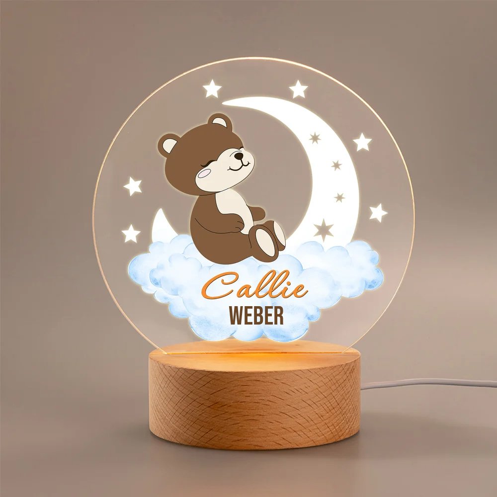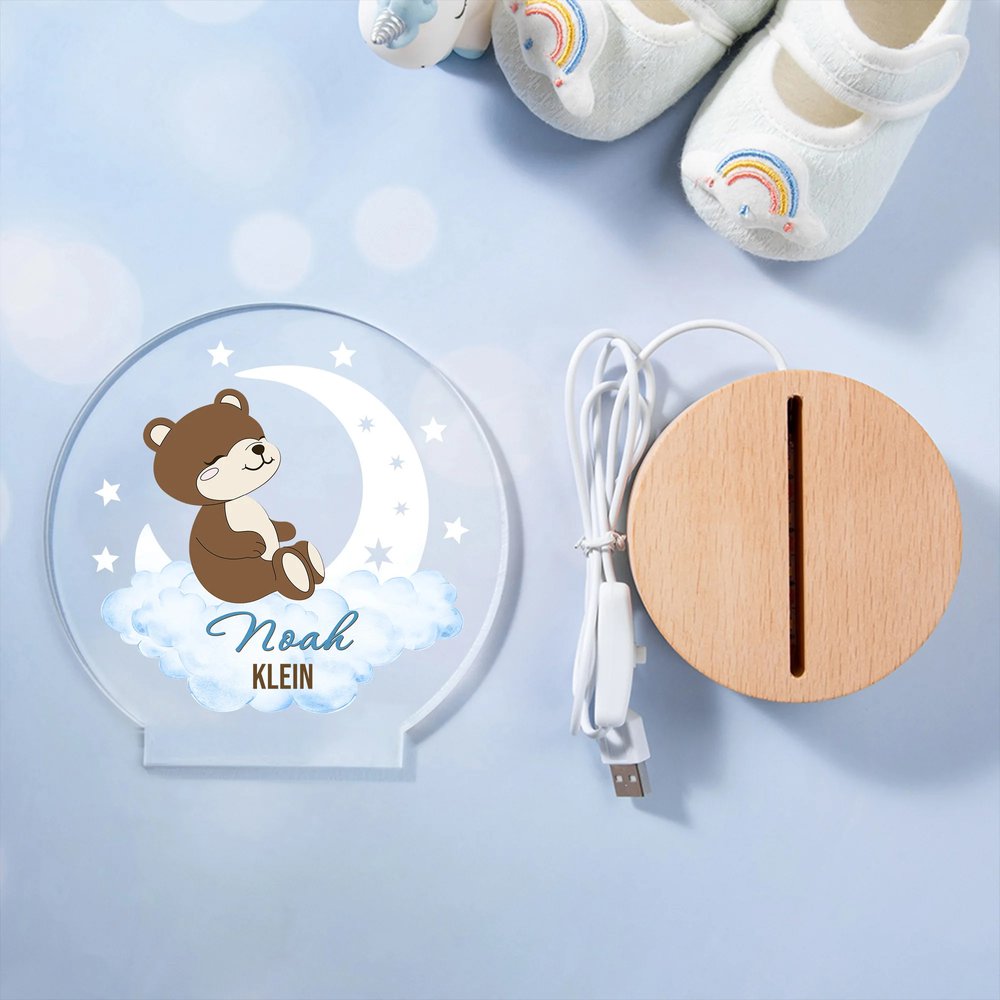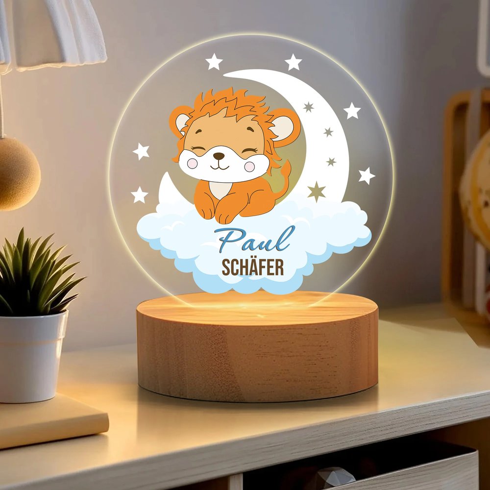 Dieses bezaubernde Nachtlicht wurde entworfen, um die Fantasie anzuregen. Es zeigt eine magische Szene mit Mond, Sternen und sanft vorbeiziehenden Wolken. Sie können aus 48 liebevoll gestalteten Waldtieren wählen – darunter ein kuscheliger Bär, ein sanfter Hirsch oder andere niedliche Begleiter –, die im Mittelpunkt stehen. Durch das Hinzufügen eines individuellen Namens und Textes wird das Nachtlicht zu einem einzigartigen Erinnerungsstück voller Bedeutung.