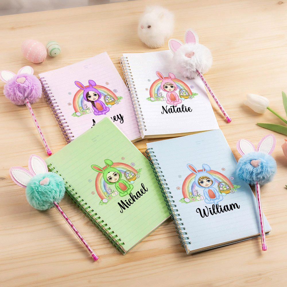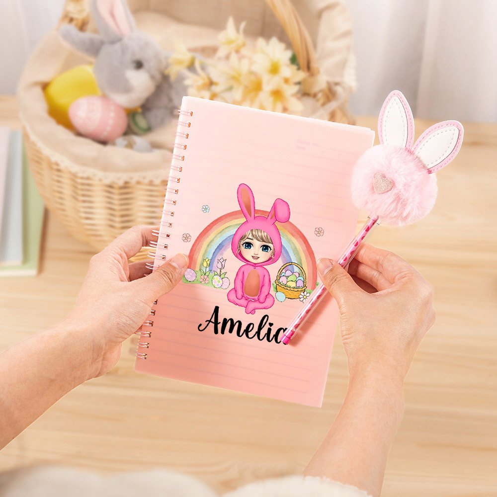Dieses charmante Notizbuch- und Stiftset zeigt eine niedliche Zeichentrickfigur in einem süßen Hasenkostüm. Es ist von bunten Ostereiern und einem schönen Regenbogen umgeben. Das Design fängt den Geist von Ostern auf lustige und skurrile Weise ein und macht es zu einem entzückenden Geschenk für Kinder.