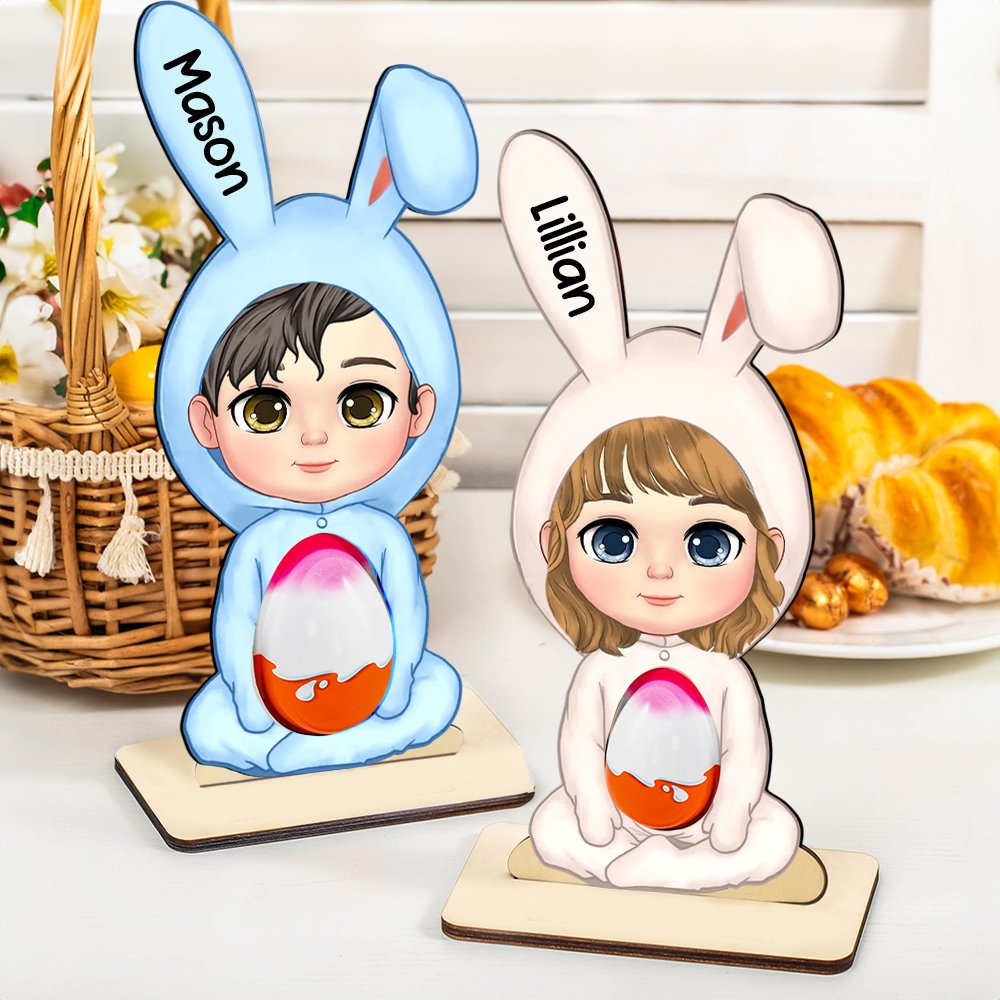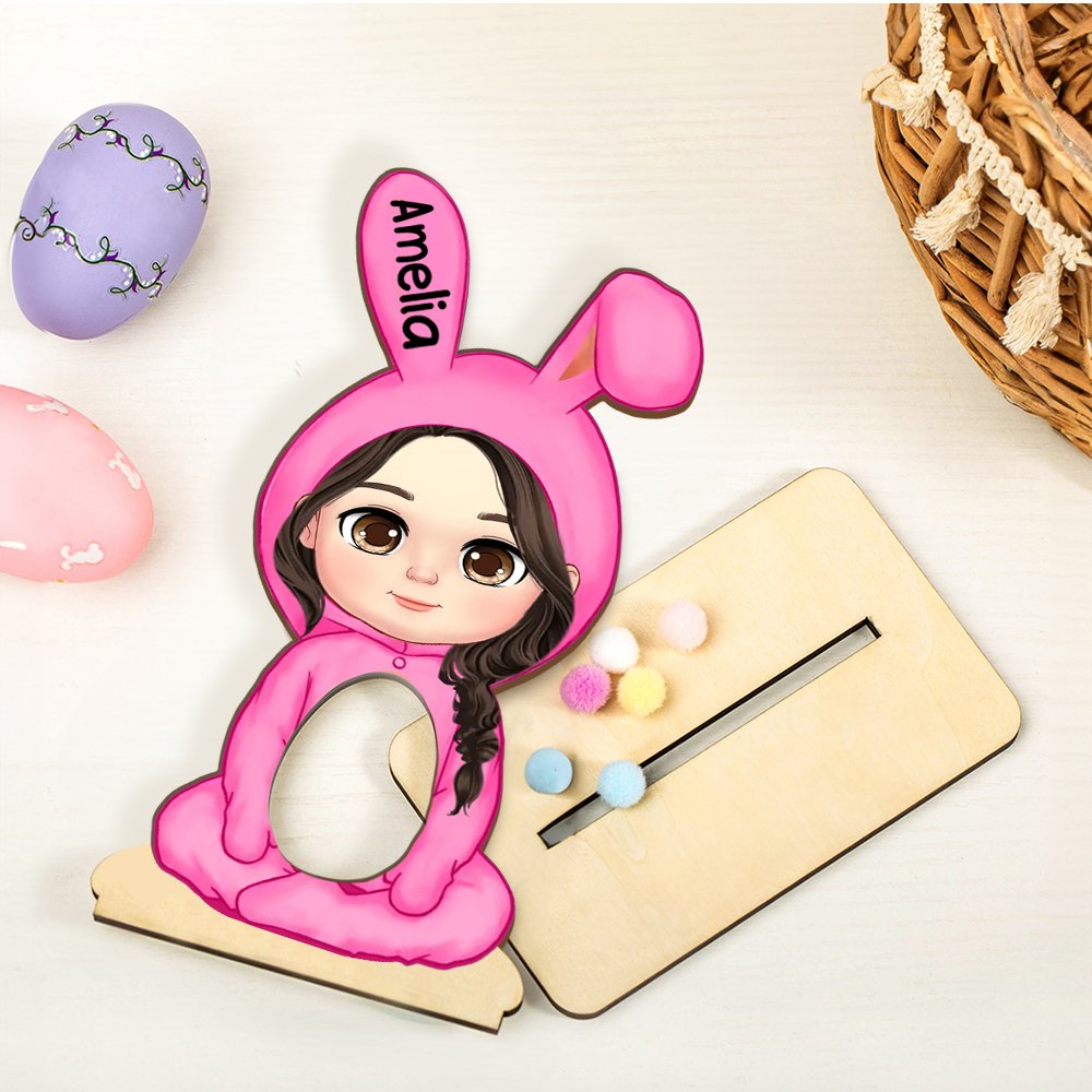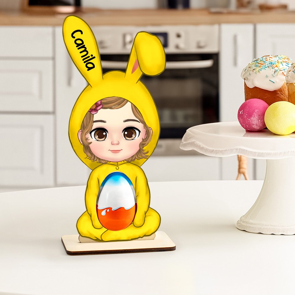 Dieser charmante hölzerne Ostereierhalter kann mit niedlichen Cartoon-Jungen und -Mädchen in Hasenkostümen personalisiert werden, um den Feiertagen eine fröhliche Note zu verleihen. Sie können die Hasenohren mit dem Namen Ihres Kindes versehen, um ihn zu einem einzigartigen Andenken zu machen.