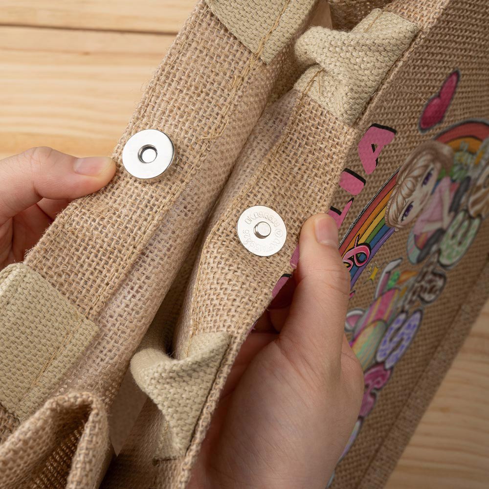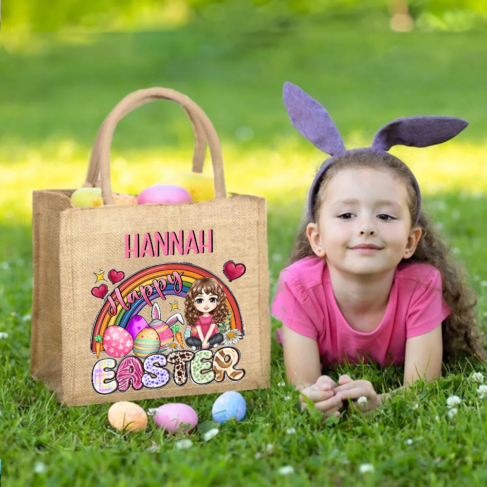 Diese große Jutetasche zeigt österliche Elemente wie Regenbögen, Eier und anpassbare Cartoonfiguren und wird mit einem speziellen Namen versehen. Perfekt, um Ihrem Geschenk eine persönliche Note zu verleihen und es wirklich einzigartig zu machen.
