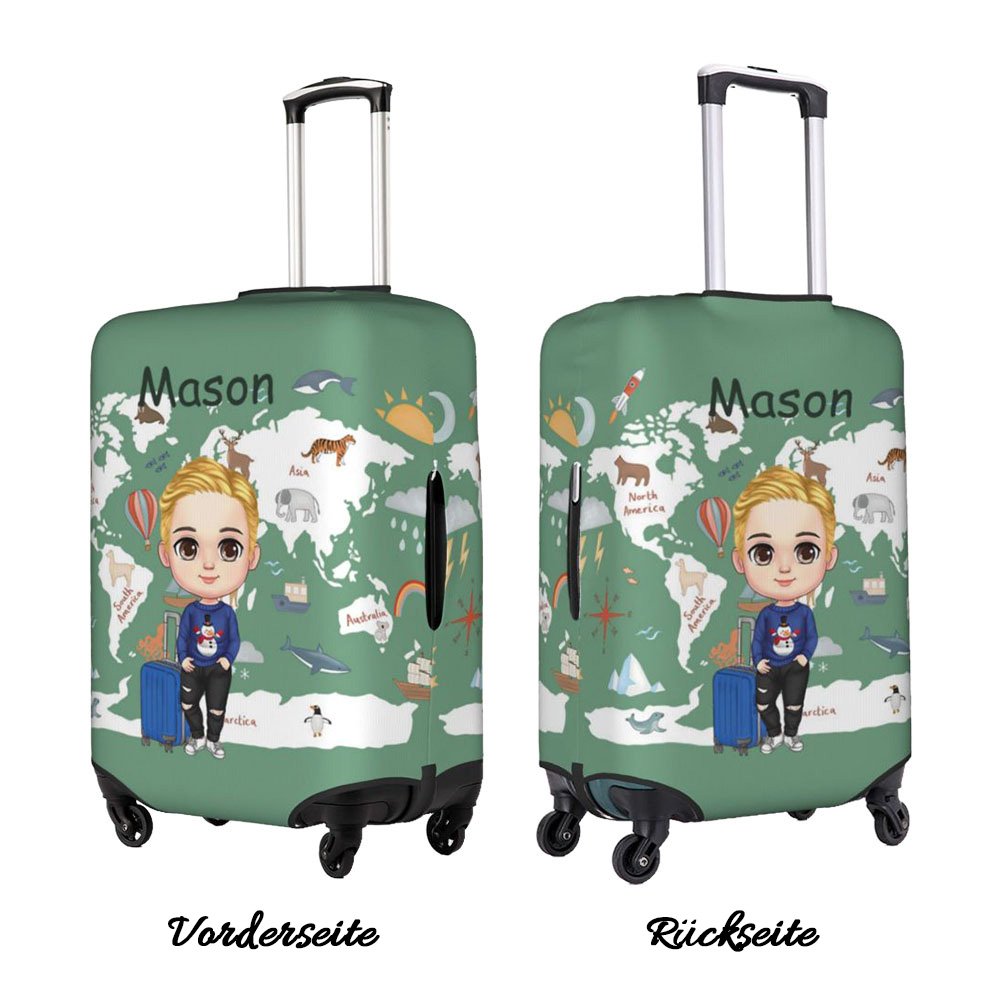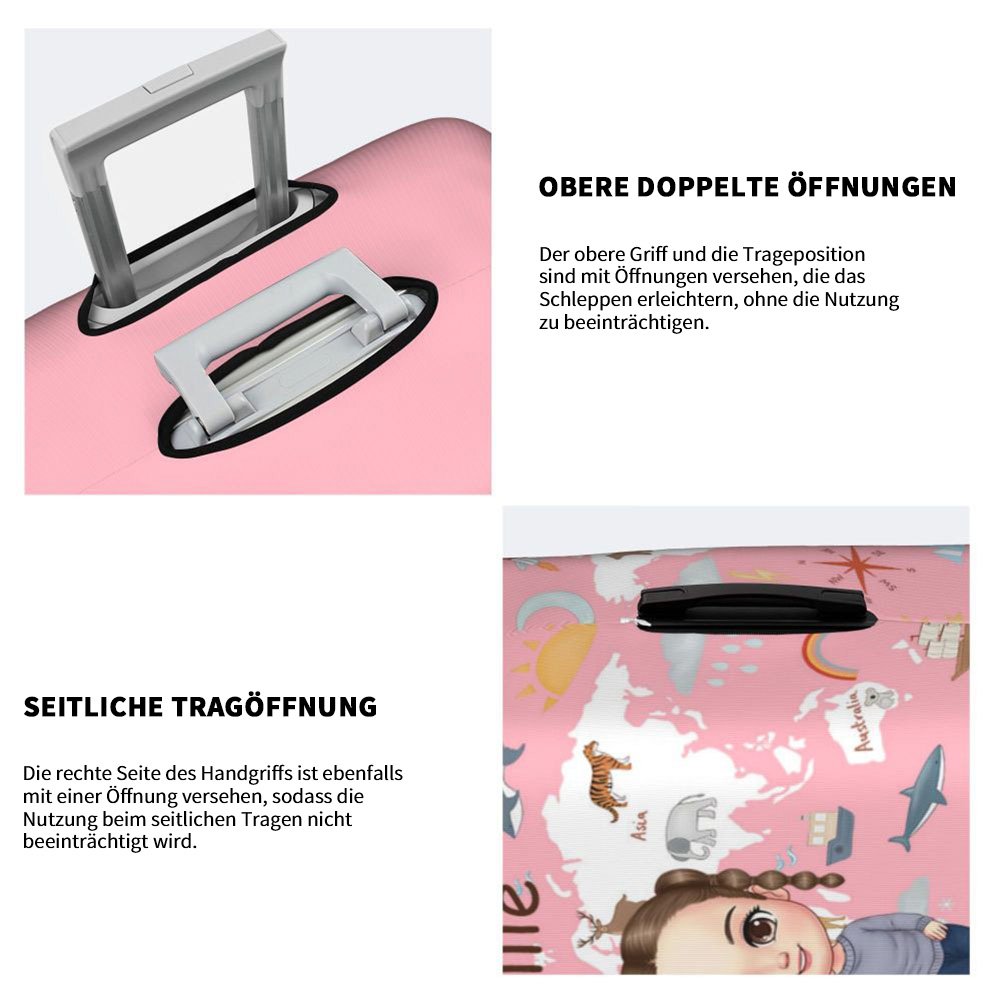 Diese personalisierte Kofferschutzhülle zeigt lebendige Cartoonfiguren, die an das Aussehen und die Vorlieben des Kindes angepasst werden können. Zu den Optionen gehören die Auswahl zwischen Jungen- und Mädchenfiguren und die Personalisierung von Gesichtszügen, Haaren und Kleidung. Dank dieses hohen Maßes an Individualisierung sticht das Gepäckstück auf den Gepäckbändern hervor.