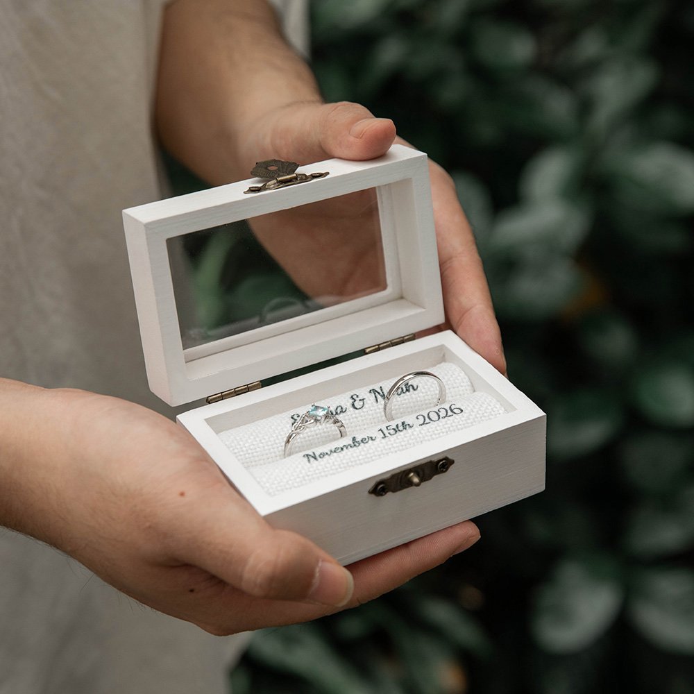 Gestalten Sie diese Ringschatulle ganz individuell, indem Sie die Namen des Paares und die Hochzeitsdaten hinzufügen. So wird die Box zu einem schönen Erinnerungsstück, das den Beginn der gemeinsamen Lebensreise eines Paares markiert.