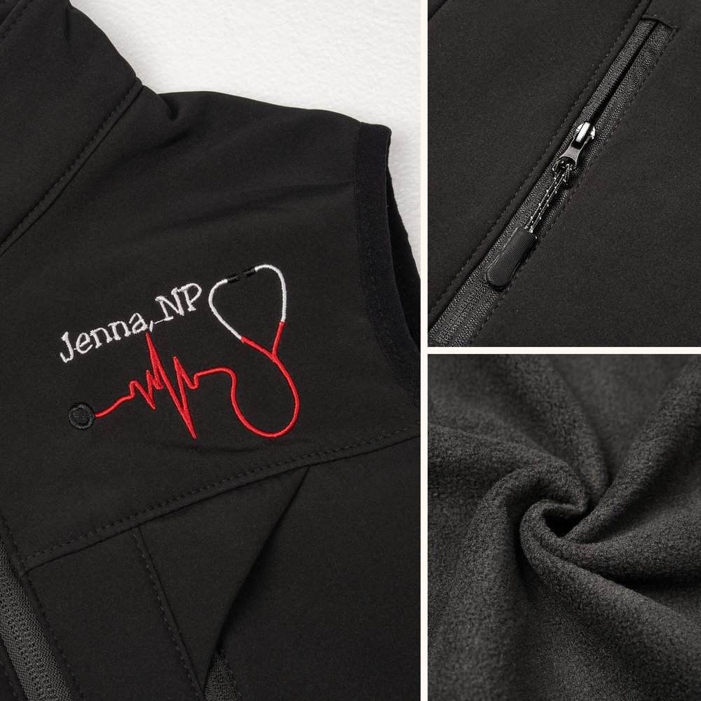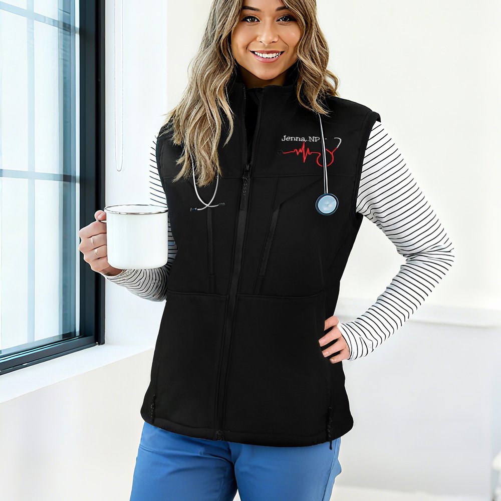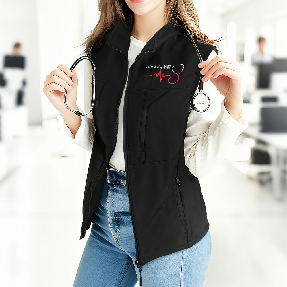 Diese Krankenschwesternweste ist individuell bestickt - mit Ihrem Namen, Stethoskopmotiven und EKG-Linien. Sie können die Farben des Stethoskopfadens wählen und so ein einzigartiges Stück schaffen, das medizinische Professionalität mit persönlichem Stil verbindet.